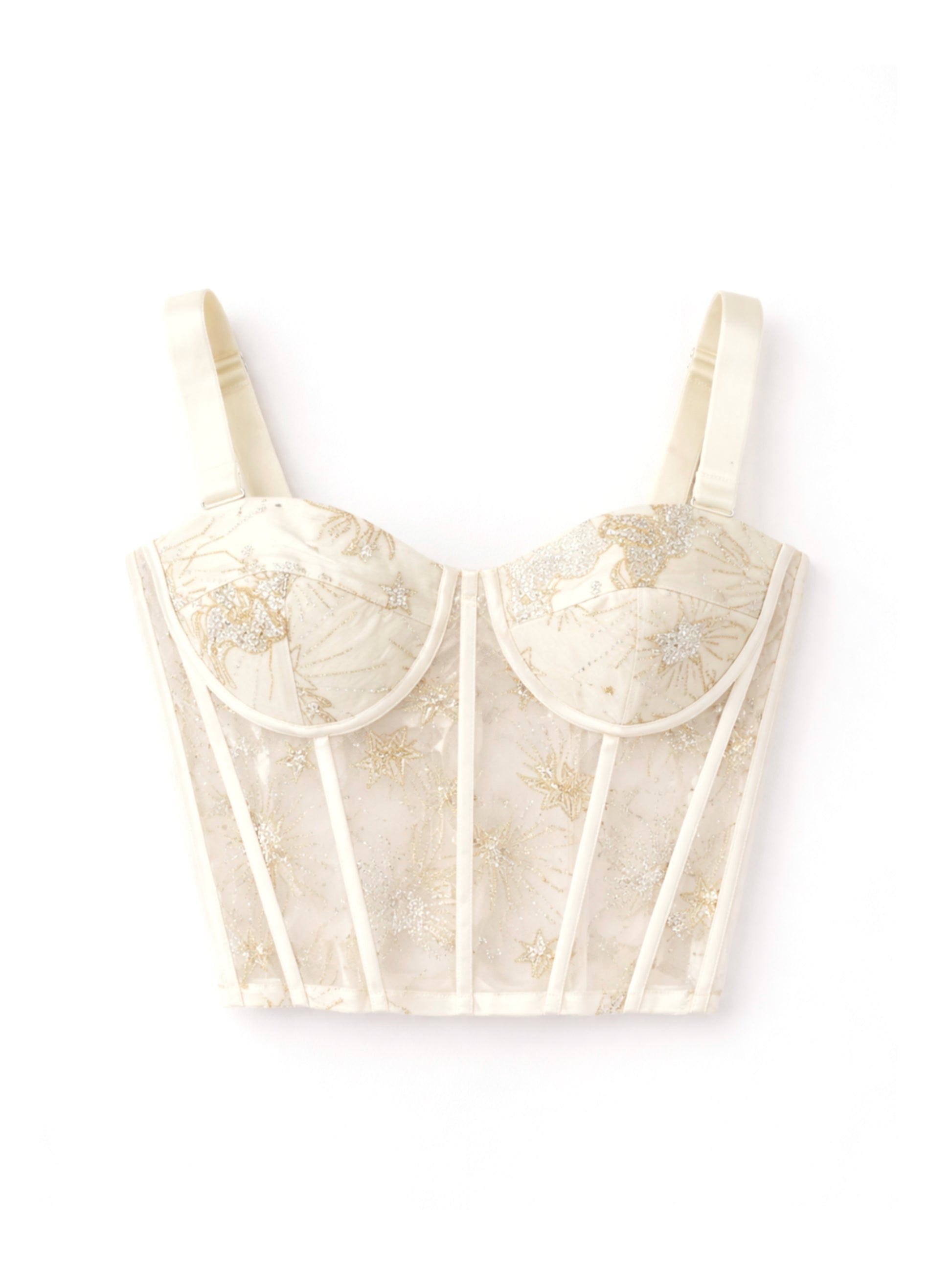 Bustier en tono marfil confeccionado en tul con glitter y estampado de constelaciones. Tiene estructura interna para soporte, ganchos en la espalda y tirantes removibles para que puedas usarlo con o sin ellos.