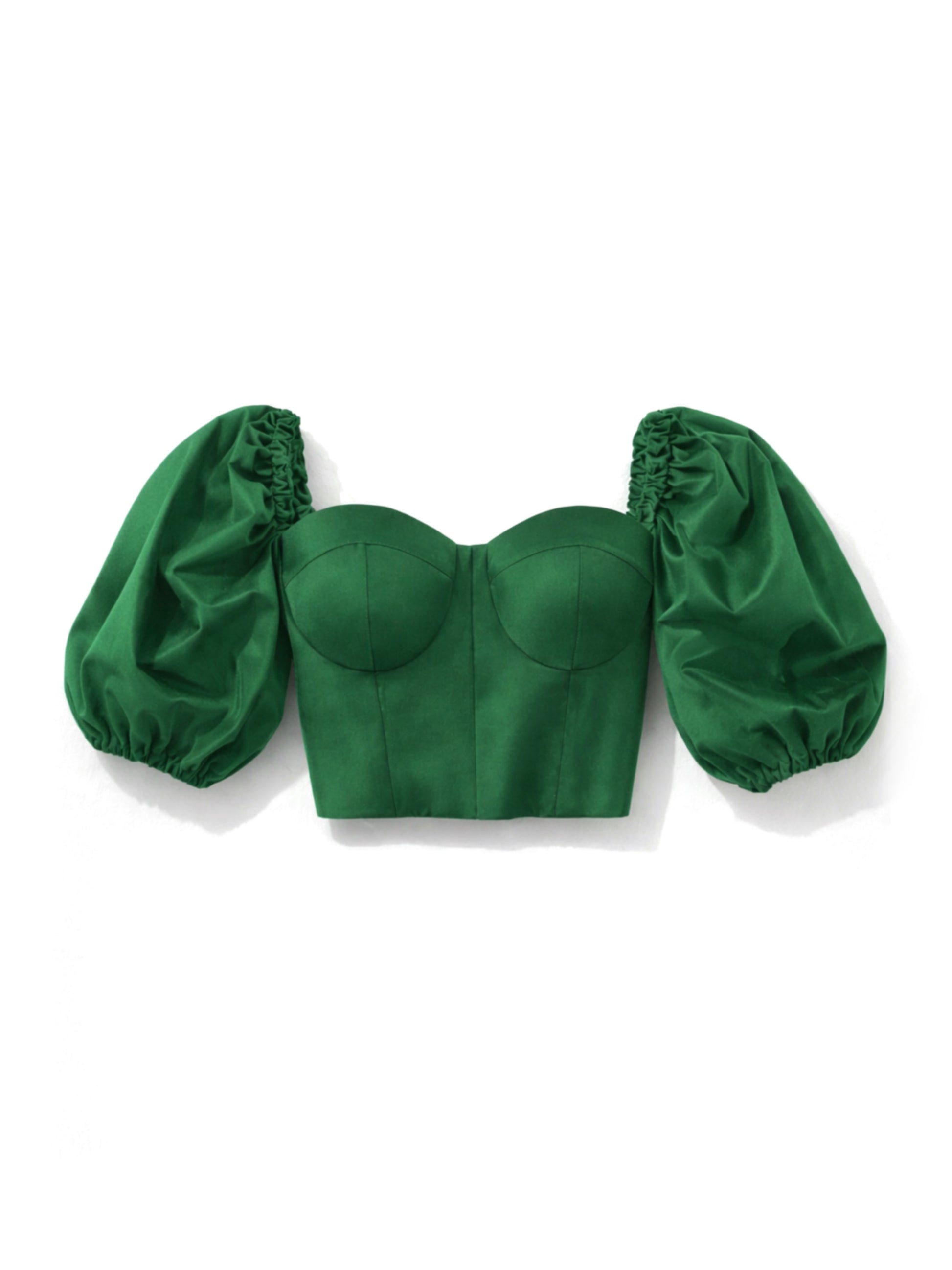 Bustier en tono verde bosque con copa C. Incluye tirantes y mangas removibles para que puedas adaptarlo a tu estilo. Cuenta con cintas ajustables en la espalda para un mejor ajuste.