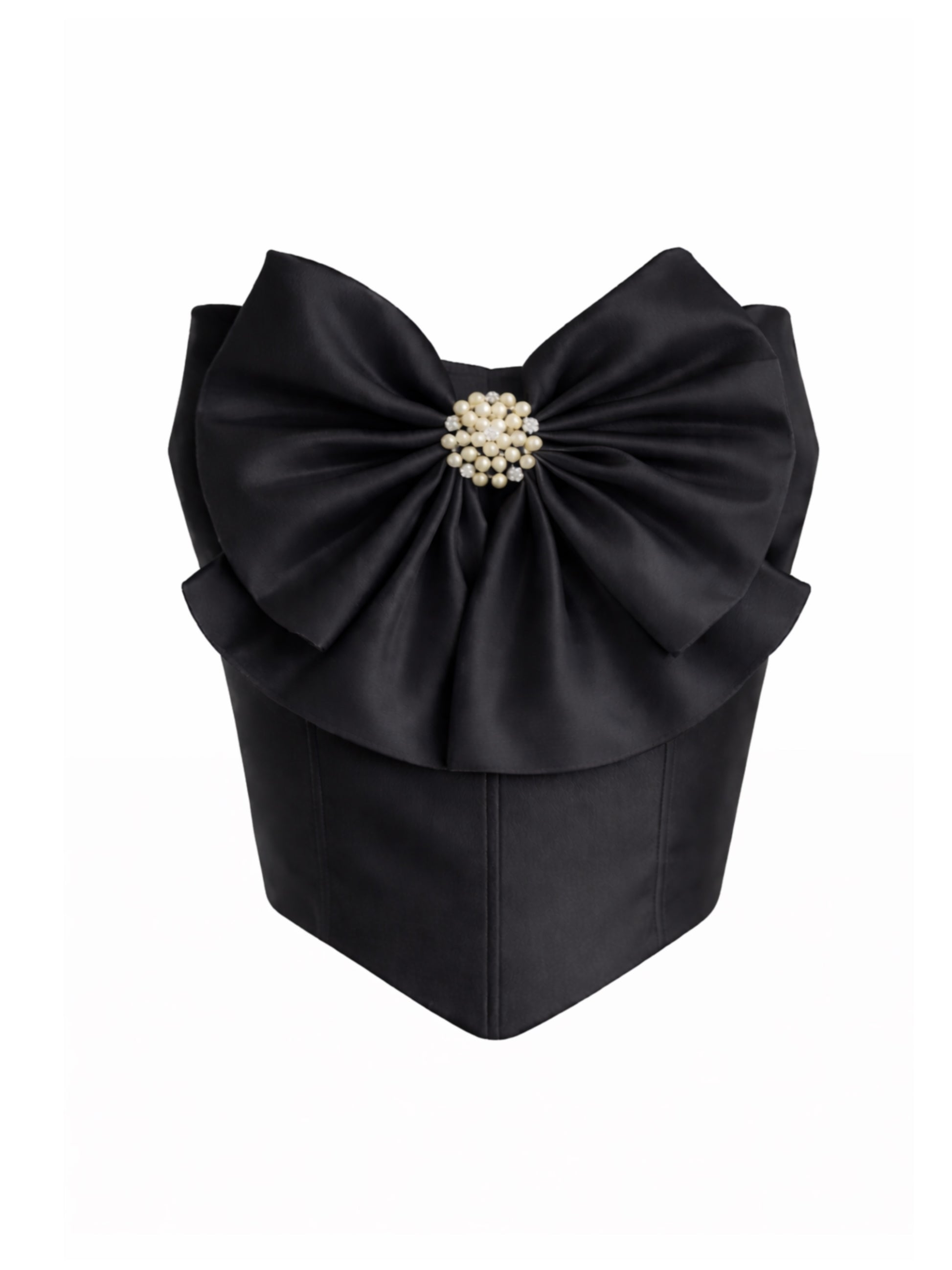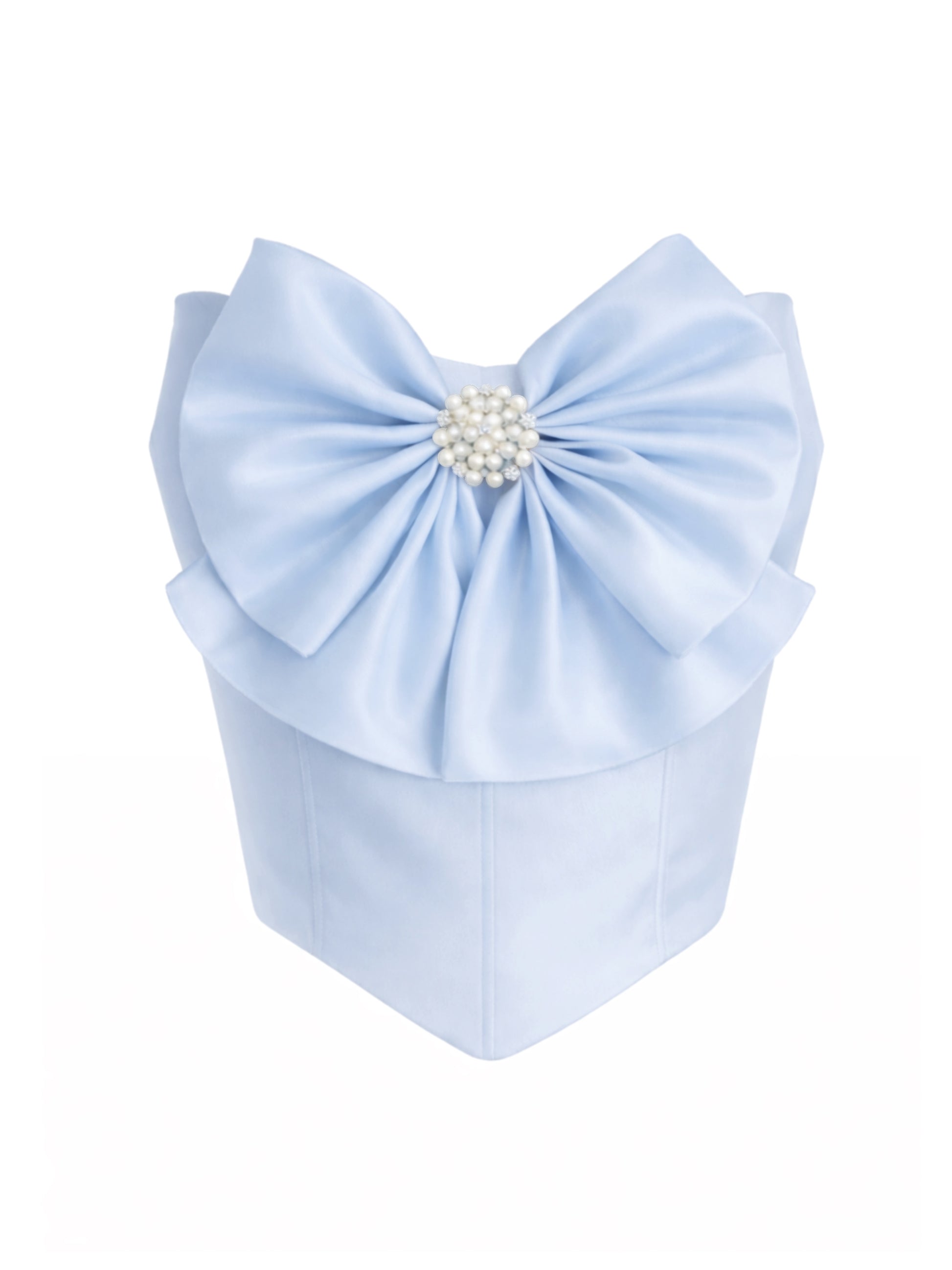 Al frente incorpora un moño decorativo con prendedor de perlas y cristales como detalle central de la pieza.