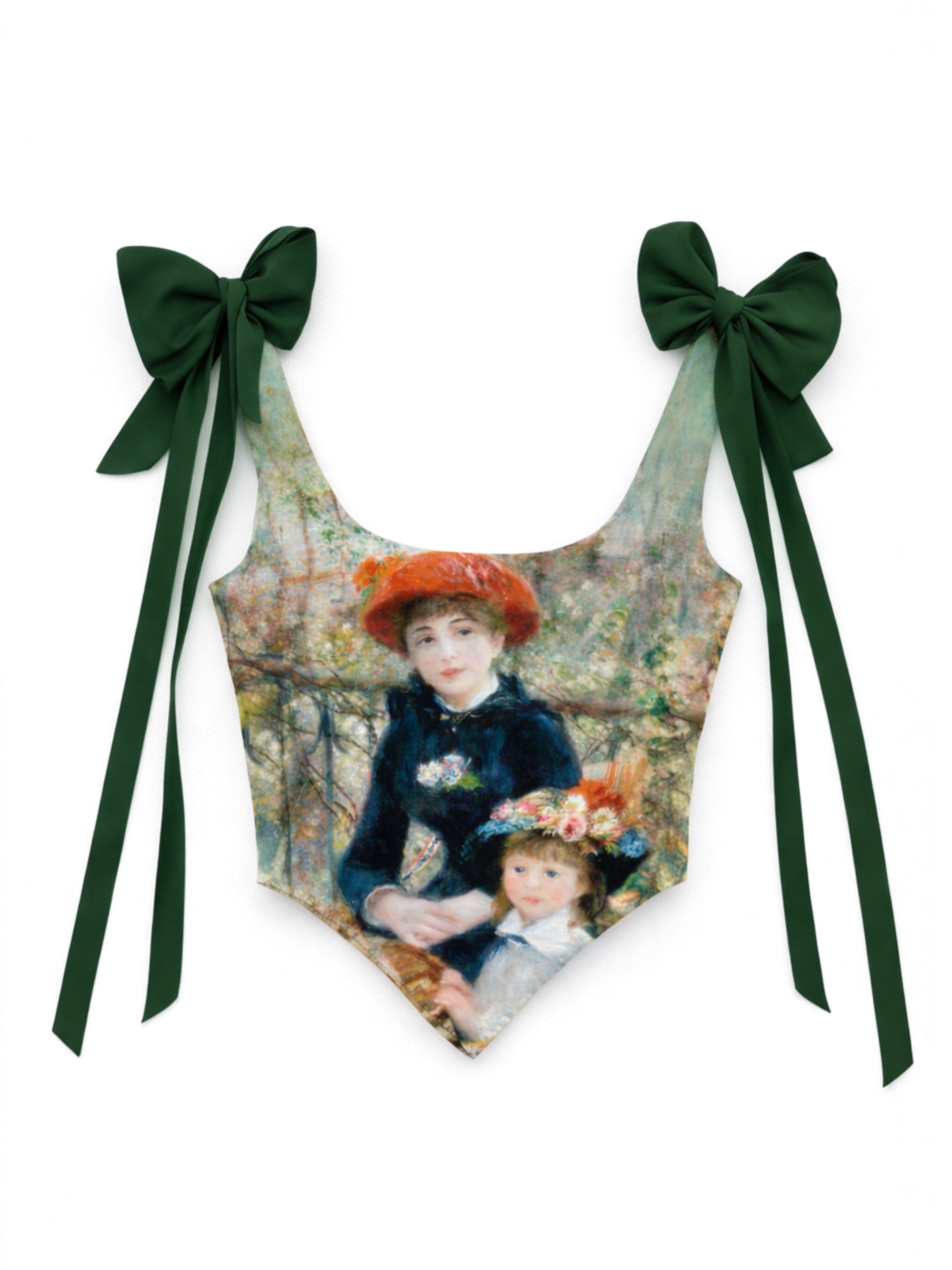 Confeccionado en razo estampado inspirado en dos hermanas de Pierre-Auguste Renoir, este corset presenta un escote en pico al frente y un cierre ajustable con cintas en la espalda para un fit personalizable.