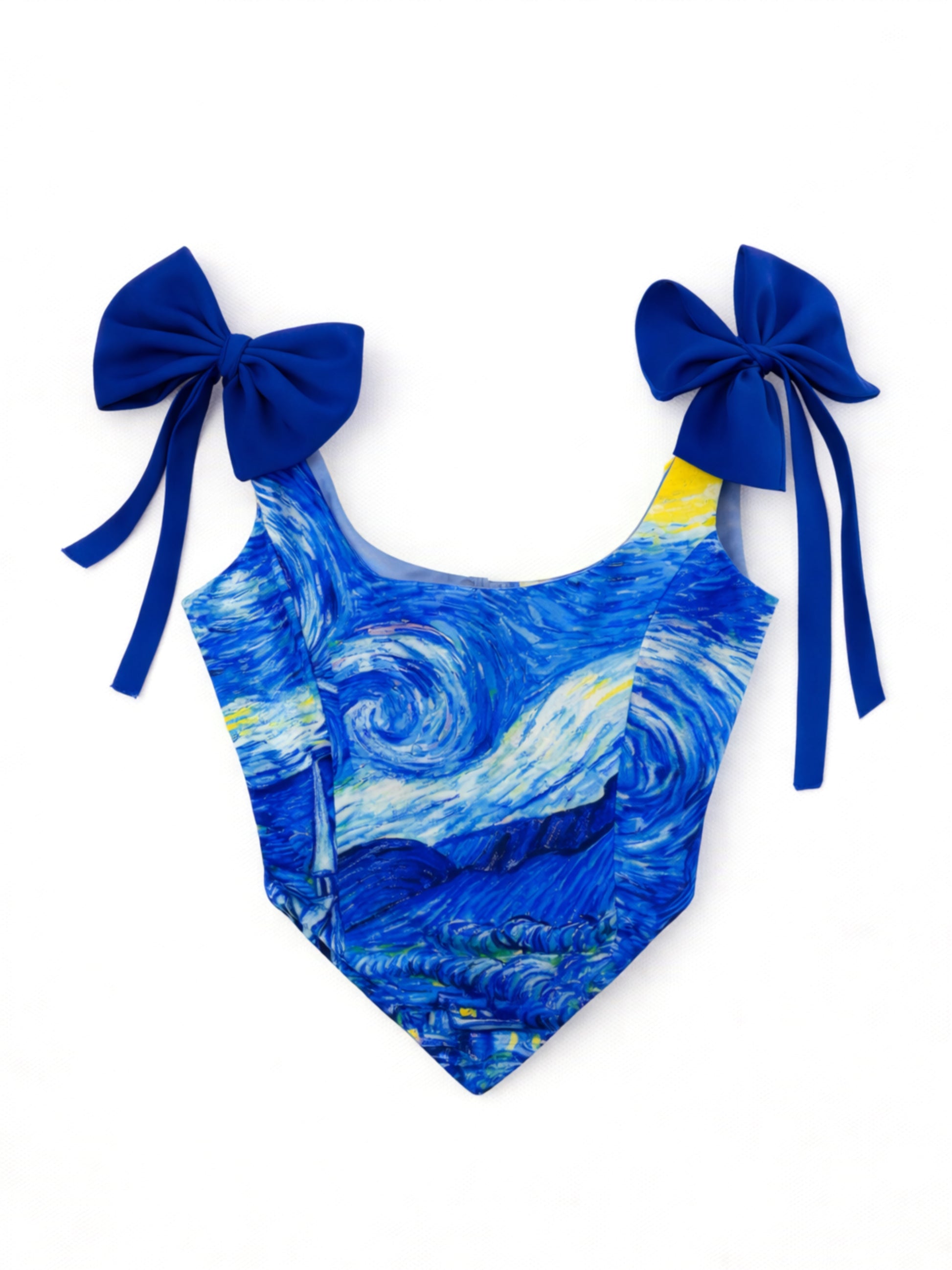 Confeccionado en razo estampado inspirado en La noche estrellada de Vincent van Gogh, este corset presenta un escote en pico al frente y un cierre ajustable con cintas en la espalda para un fit personalizable.
