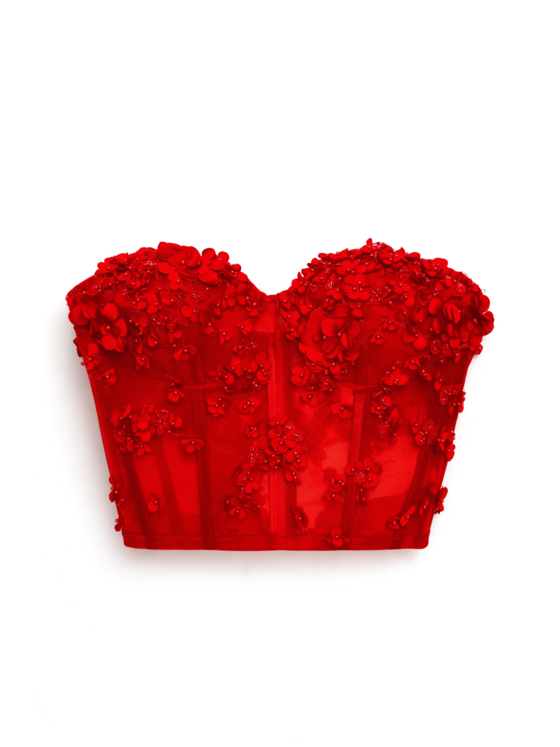 Bustier confeccionado en tul con aplicaciones de flores 3D en tono rojo.