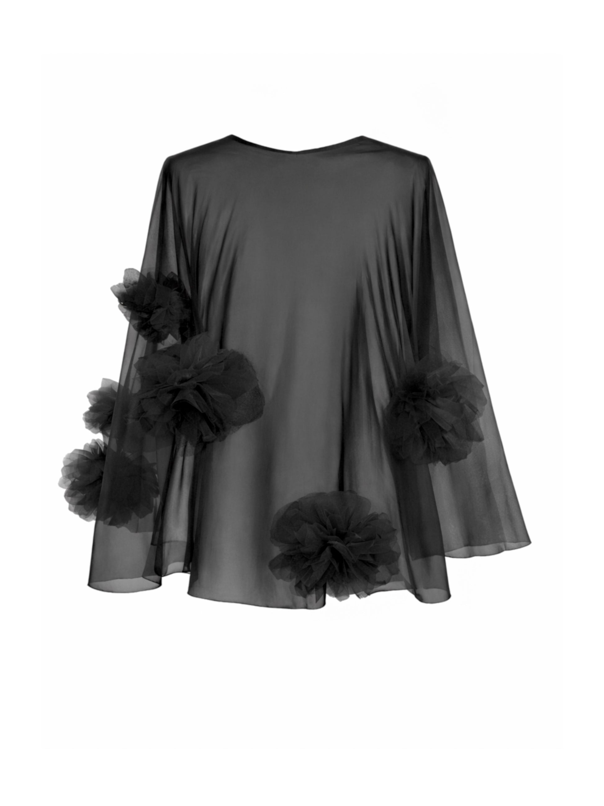 One-size-fits-all cape, approximately 150 cm long, made of tulle with handmade flowers. It can be fully closed at the back with snaps or worn open as an over-cape. It includes openings at the sides for easy access to the hands and can be worn inside out or inside out.