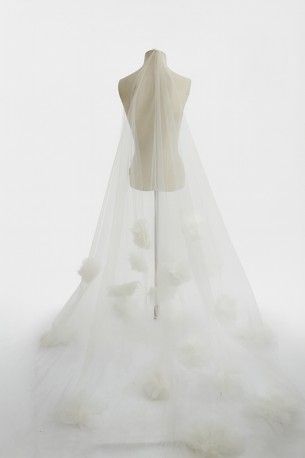 Velo de 200 cm o 100 cm de largo en tul, decorado con flores de tul hechas a mano. Tiene peineta de plástico incluida