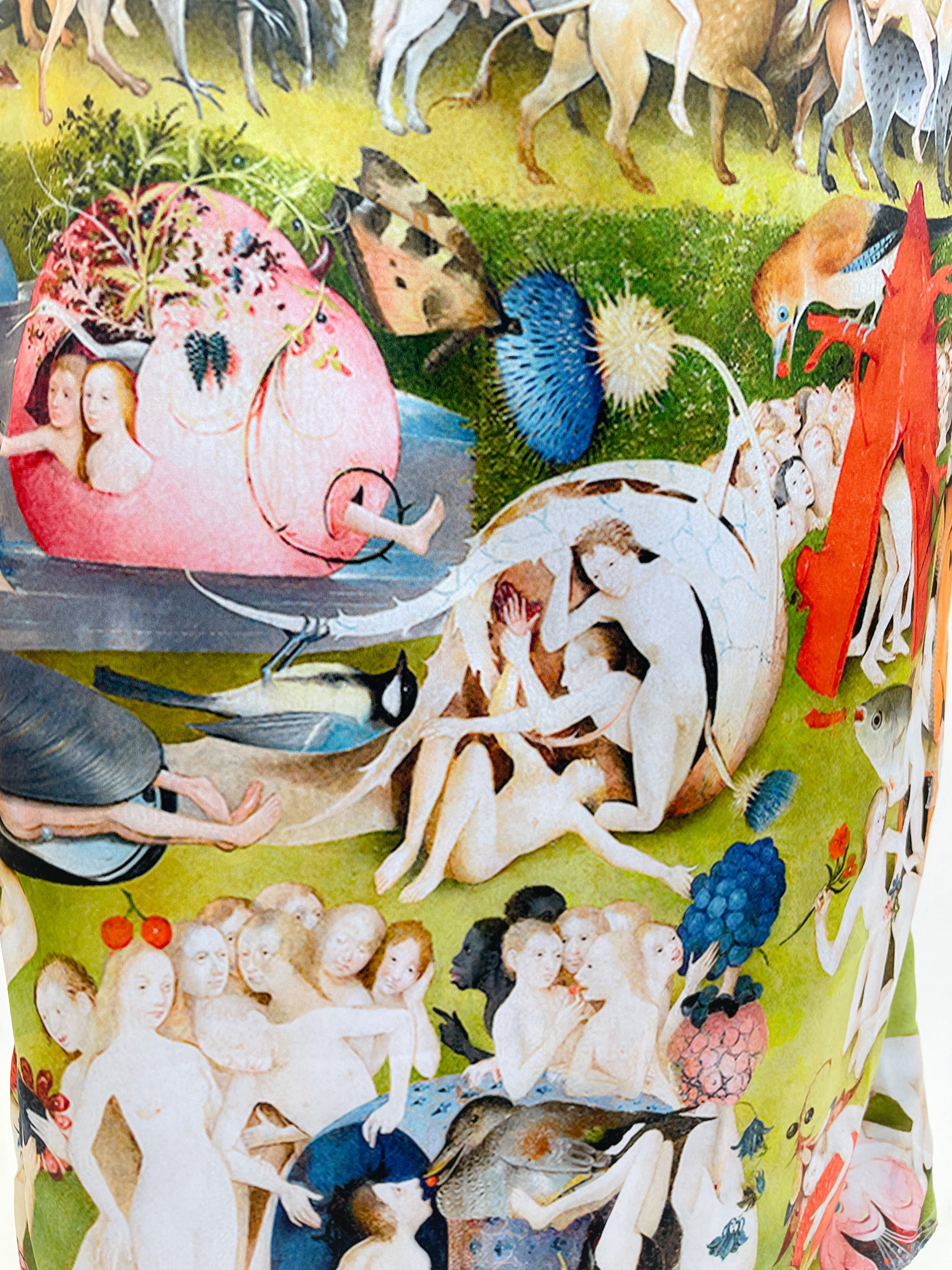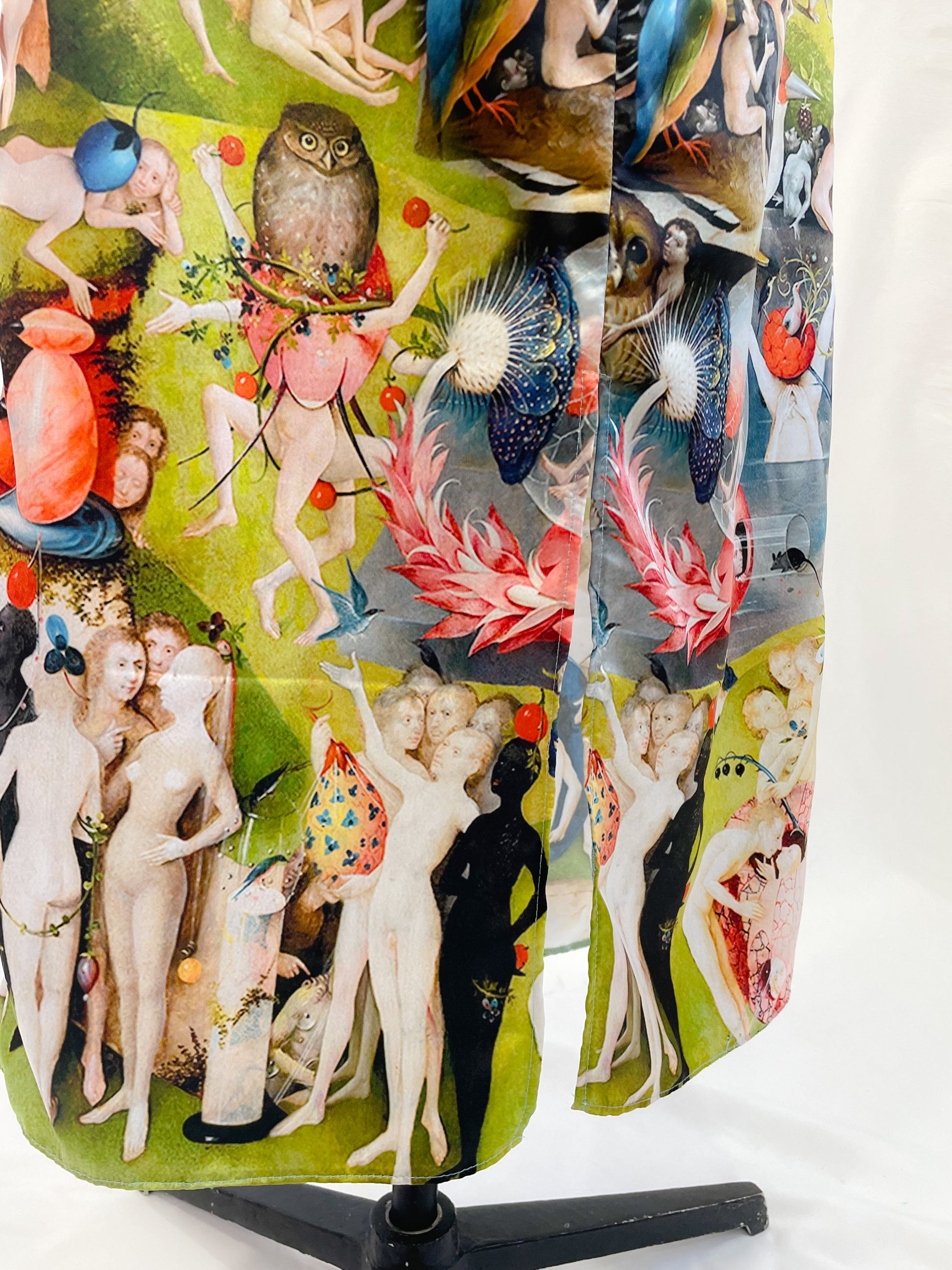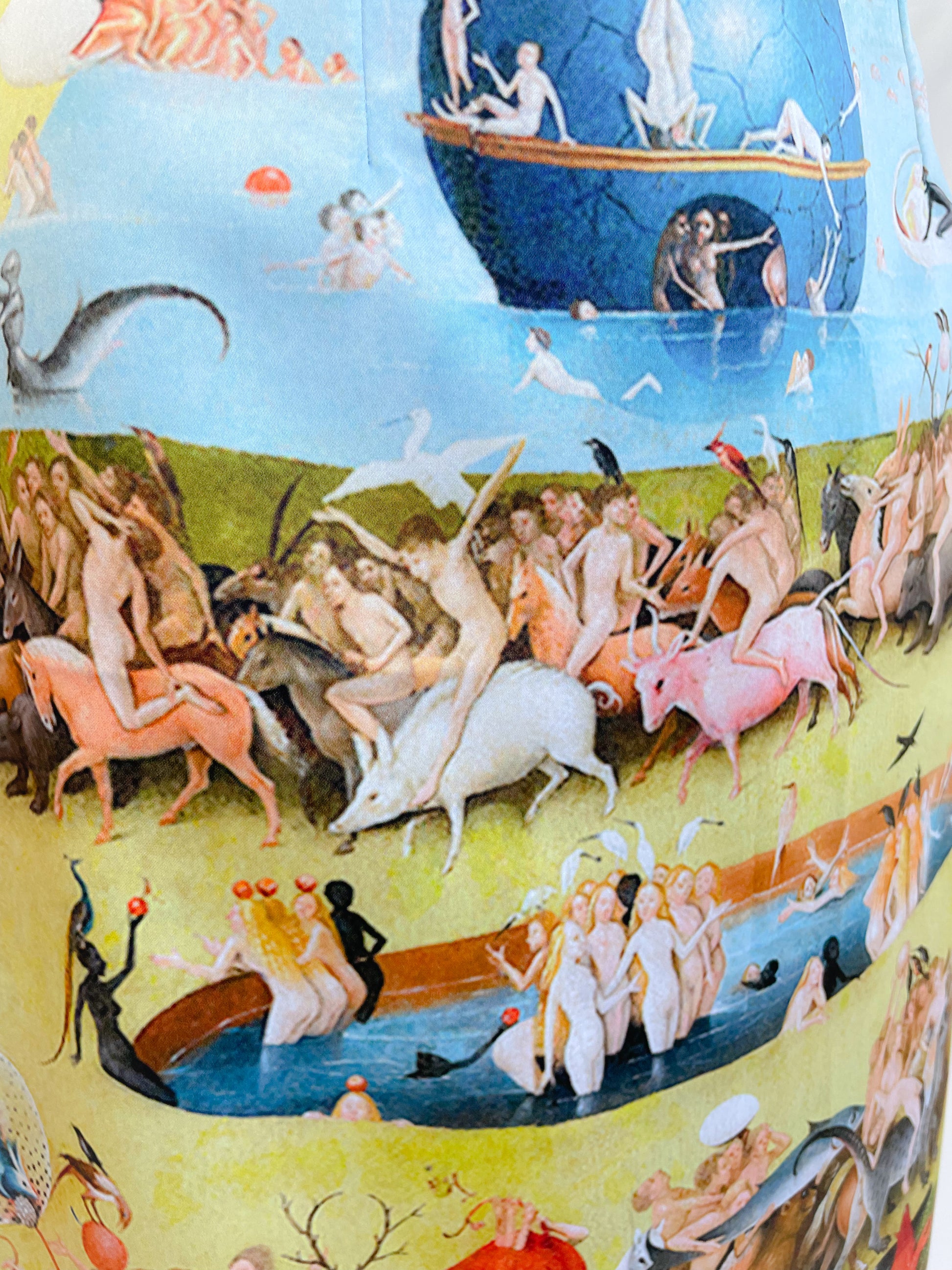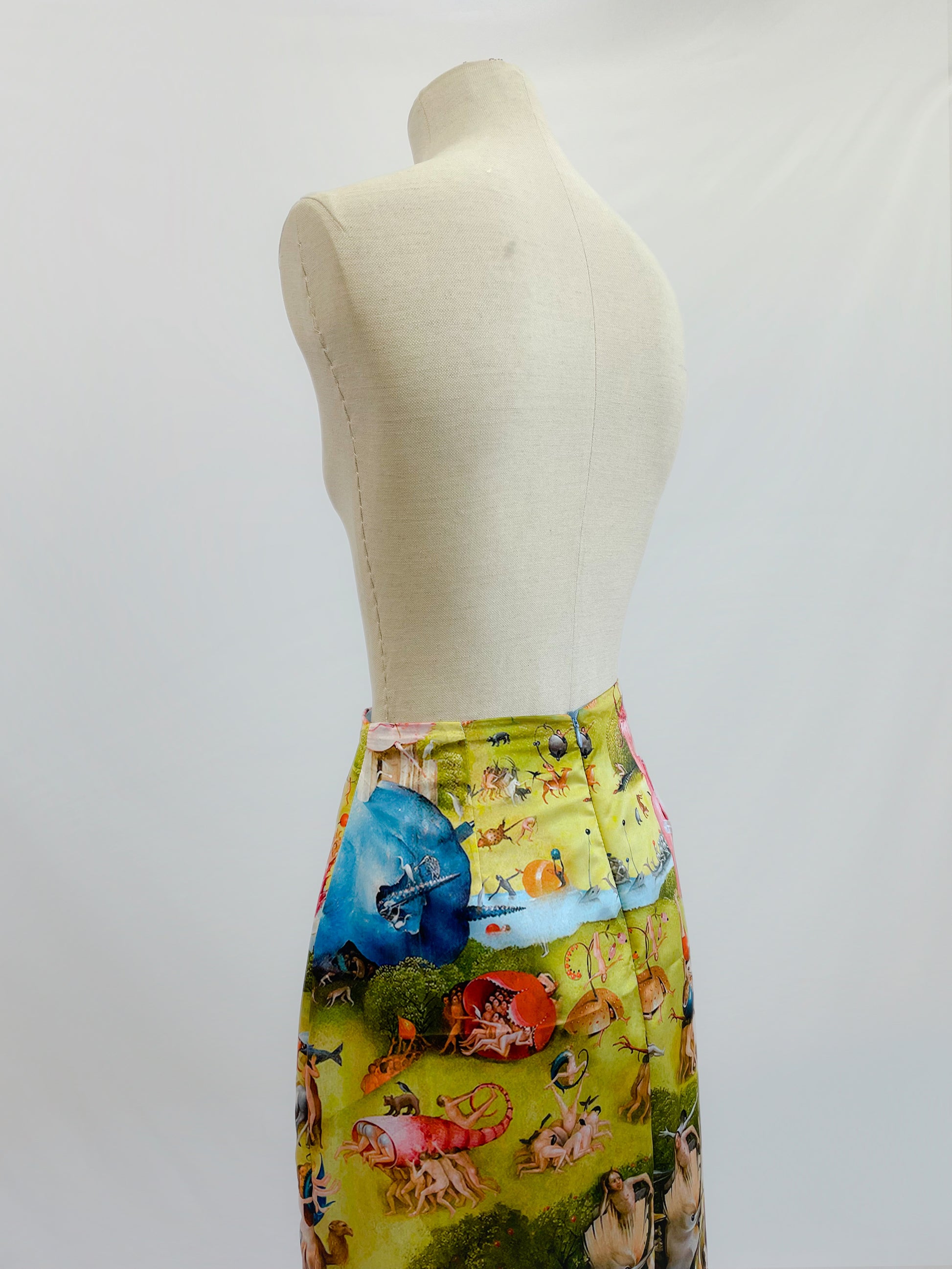 Exclusive print inspired by Bosch's painting The Garden of Earthly Delights. Straight cut with an invisible zipper at the back and a back slit for greater comfort while walking.