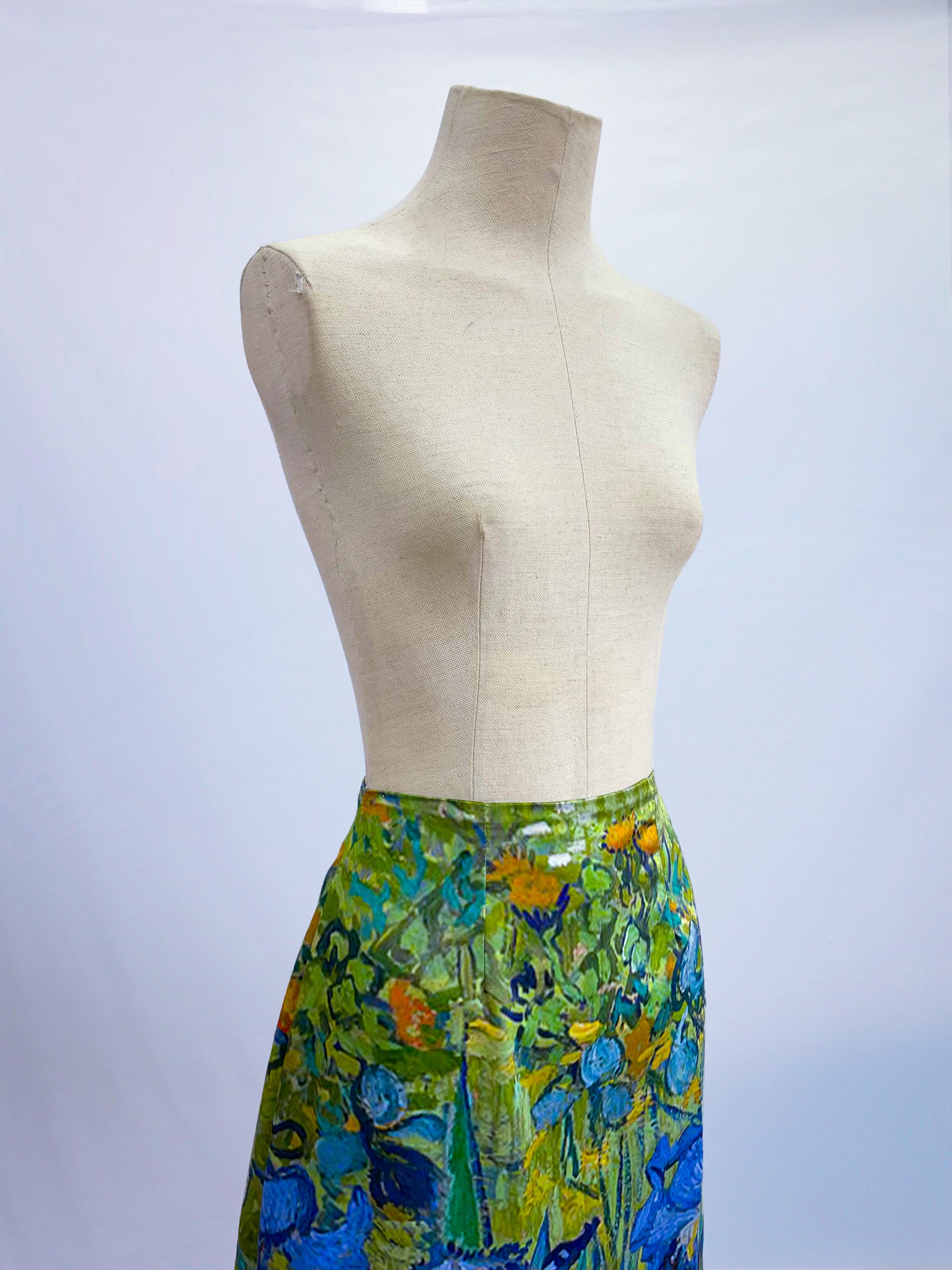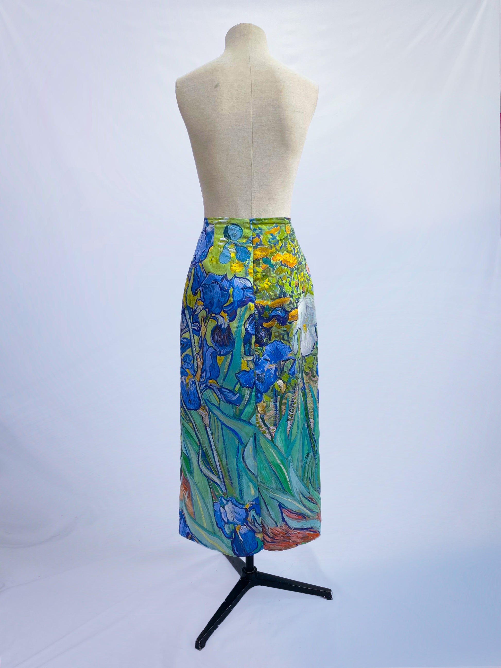 Exclusive print inspired by Van Gogh's painting "Irises." Straight cut with an invisible zipper at the back and a back slit for greater comfort while walking.