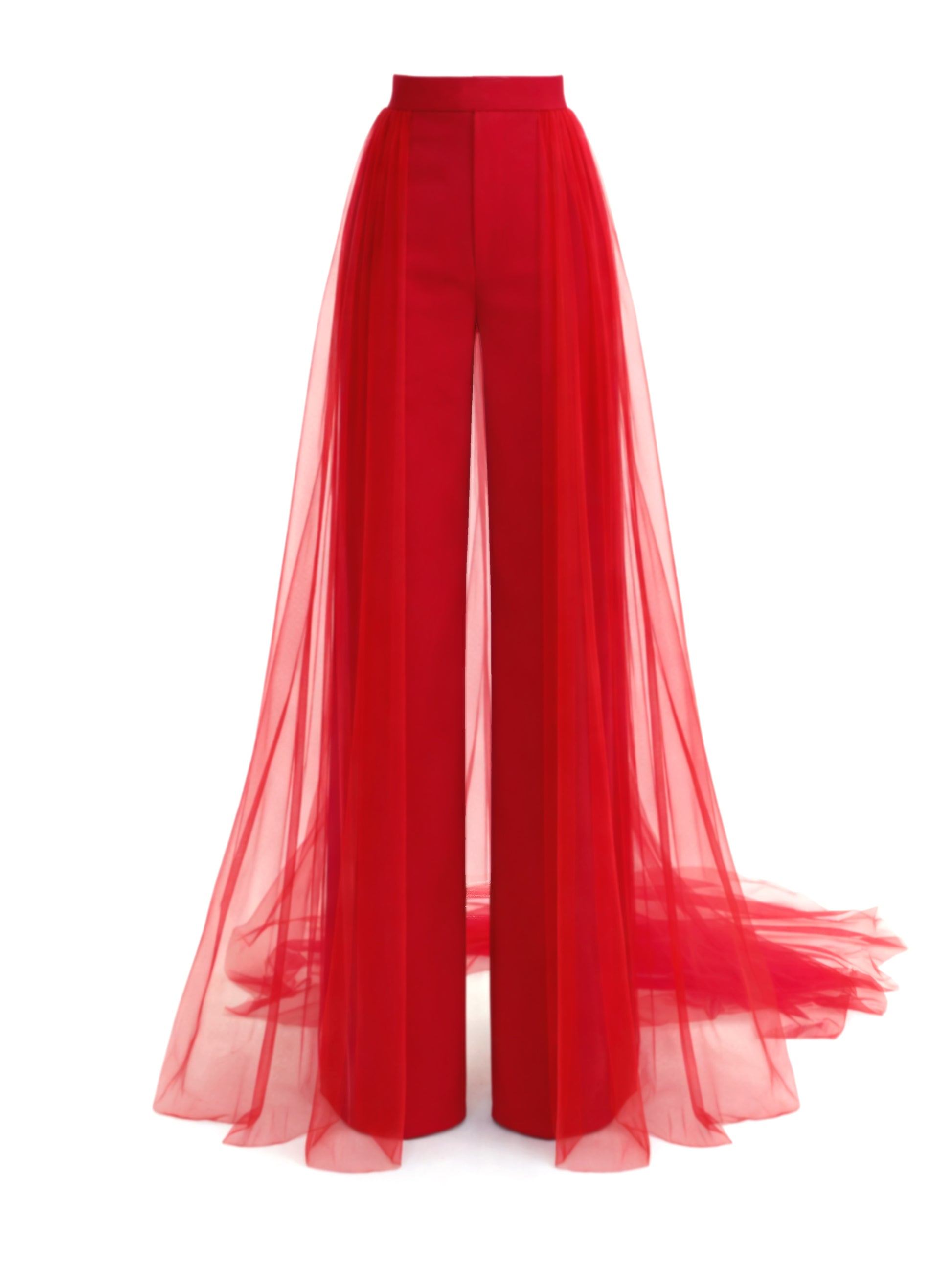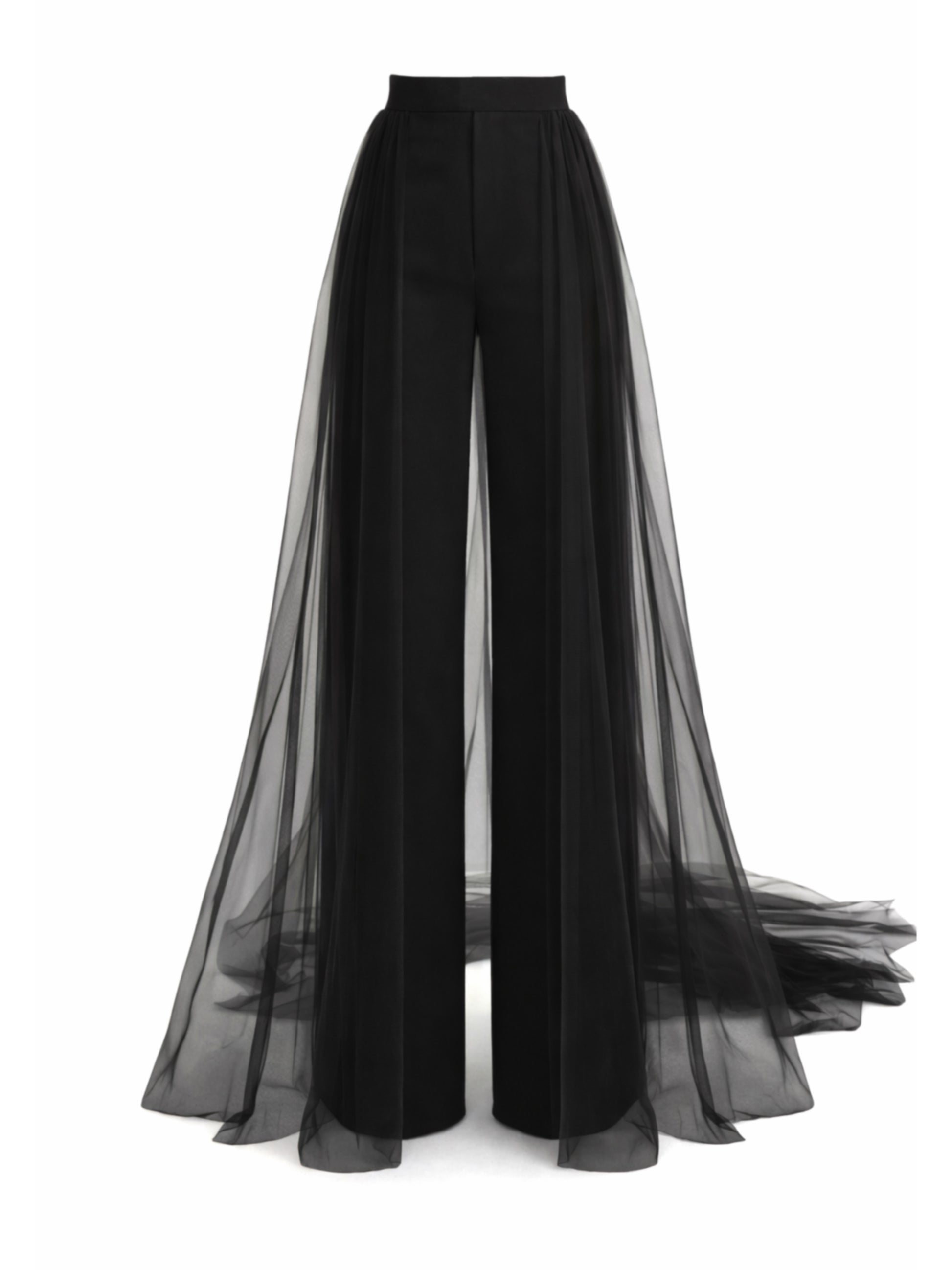 It includes a pleated optical tulle train attached at the back, with a visible length of 2 meters from waist to hem. The train can be left loose for a dramatic effect or gathered for a feminine and functional look with buttons, inspired by Empress Sissi's dresses and the 19th-century bustle style.