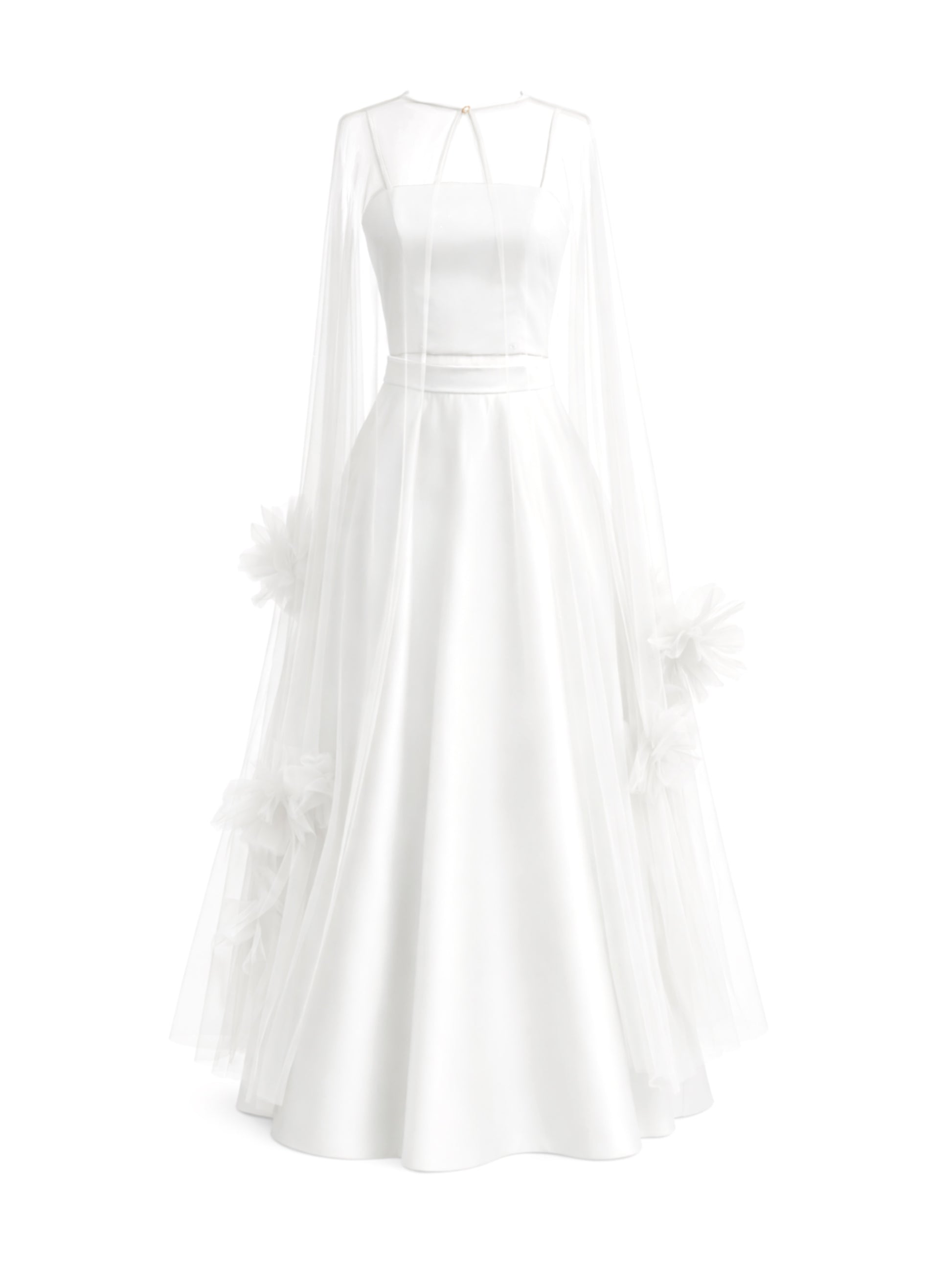 - One-size cape: approximately 150 cm long, with handmade tulle flowers. It can be fully closed at the back with snaps or left open; it has openings at the sides for easy hand access and can be worn right side out or inside out.