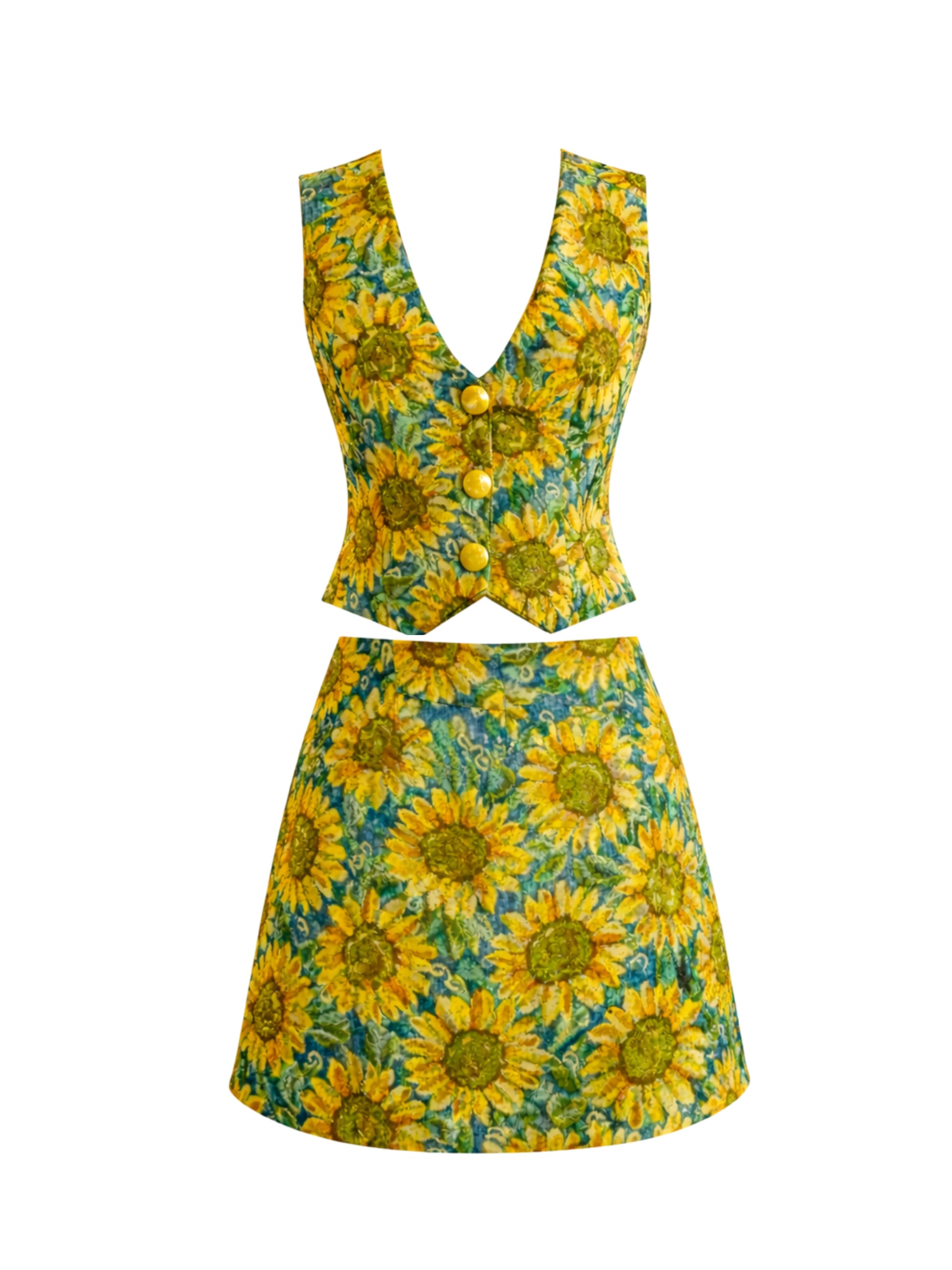 Set made of tapestry with a choice of two prints: kittens or sunflowers. The skirt includes functional pockets and an invisible zipper closure in the back, with a length of approximately 45 cm. The vest has buttons down the front, a satin back, and an inner lining. The shirt shown in the photos is not included.