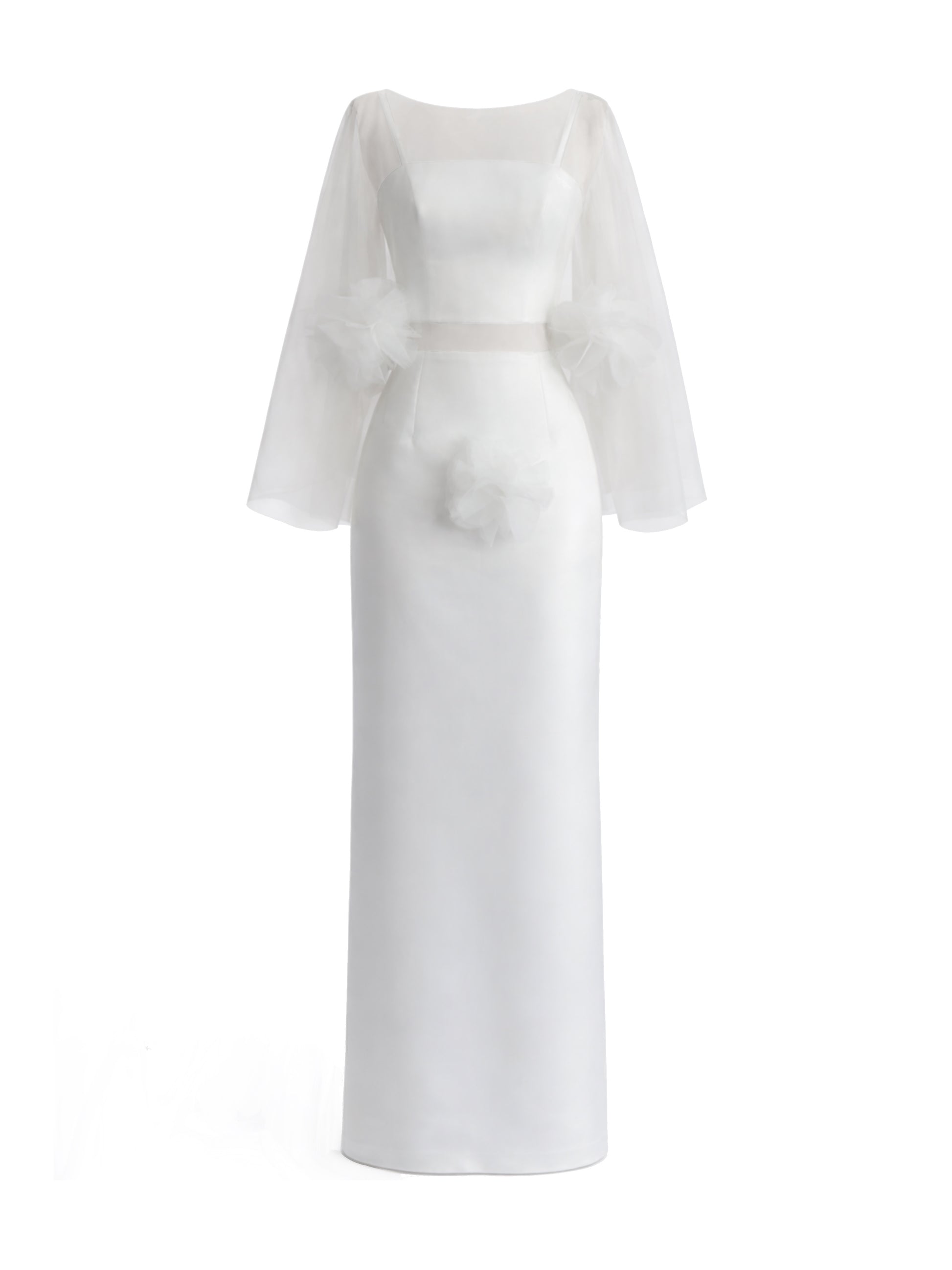 Composition: Top and skirt: 100% satin (outer and inner). Cape: optical tulle with handmade flowers.