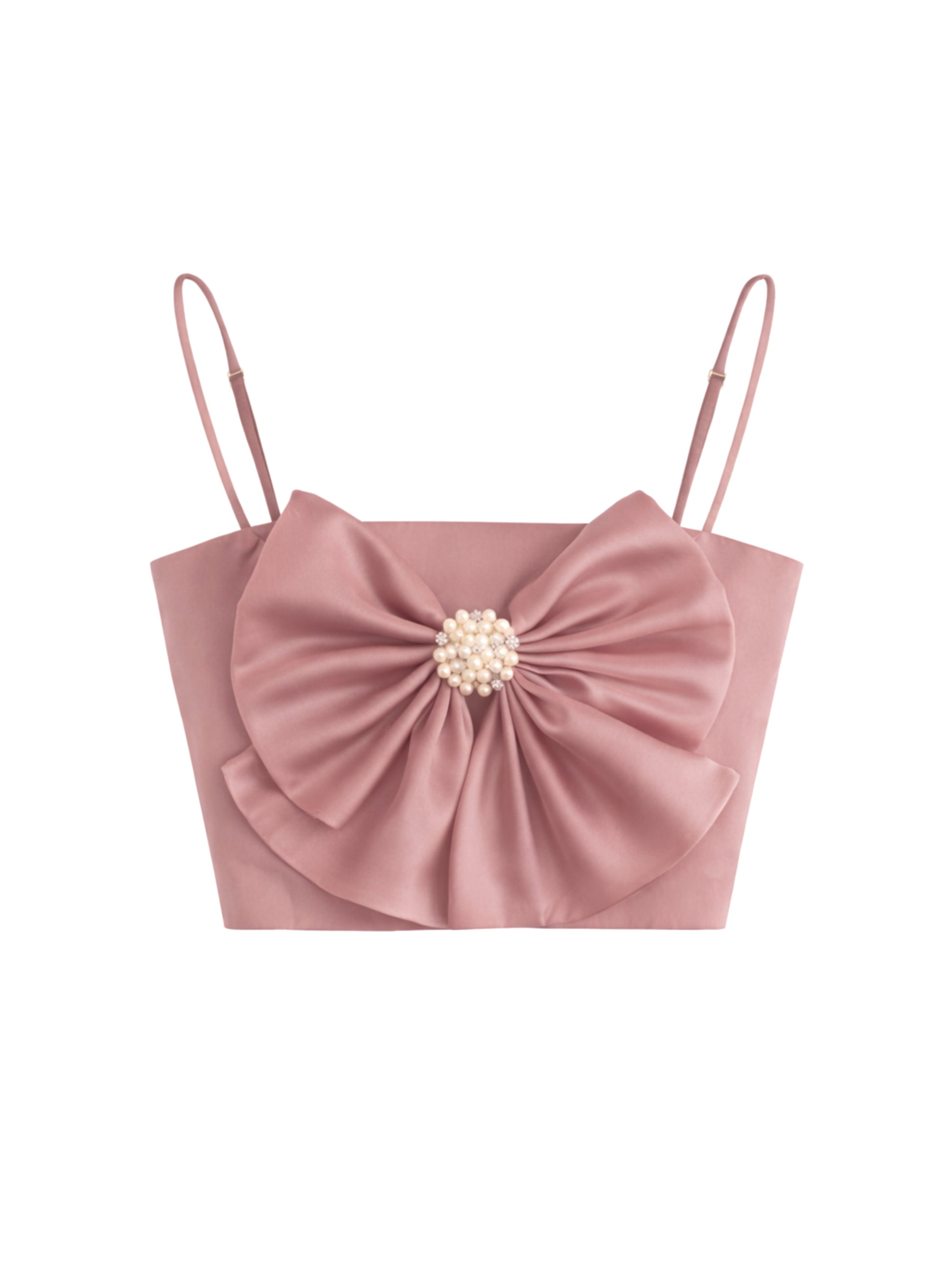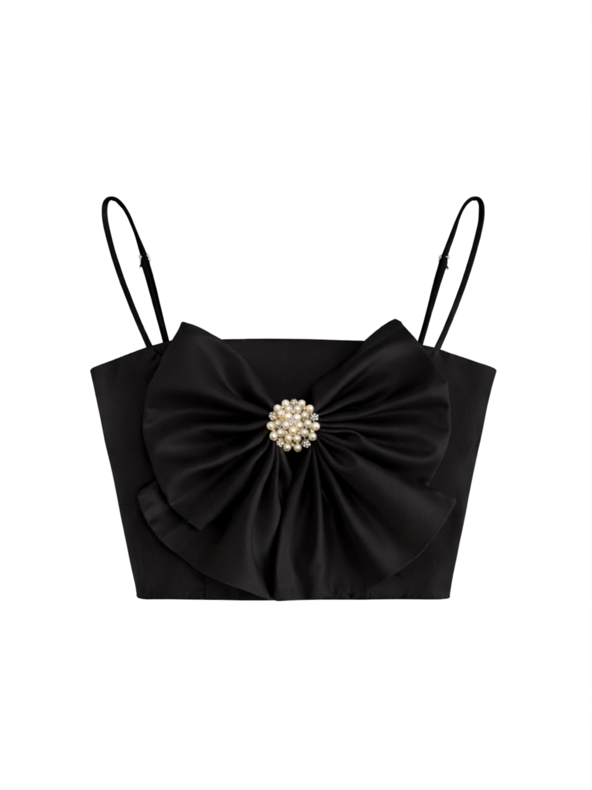 Top with adjustable satin straps with bow and brooch. Back closure with adjustable straps.