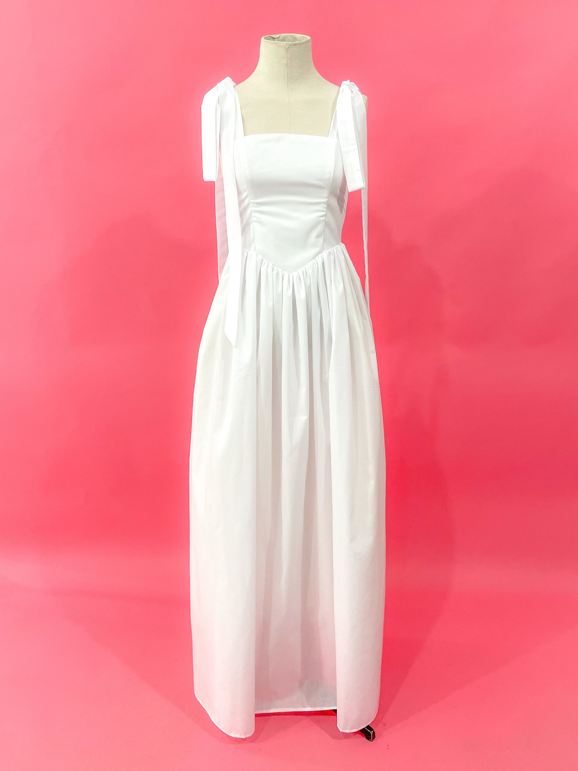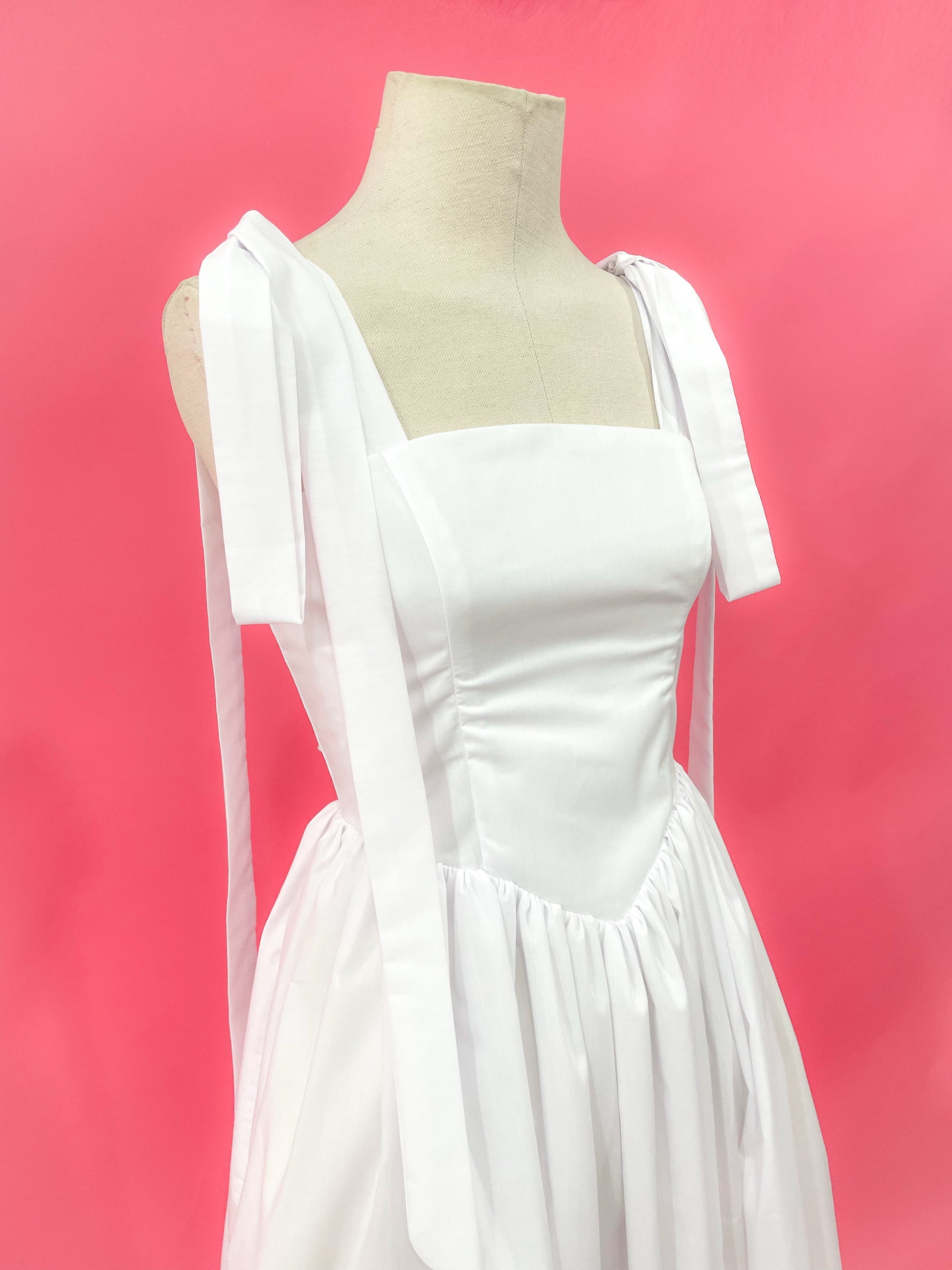 Sleeveless cotton dress with adjustable tie straps, adjustable ribbons at the back, and side pockets.