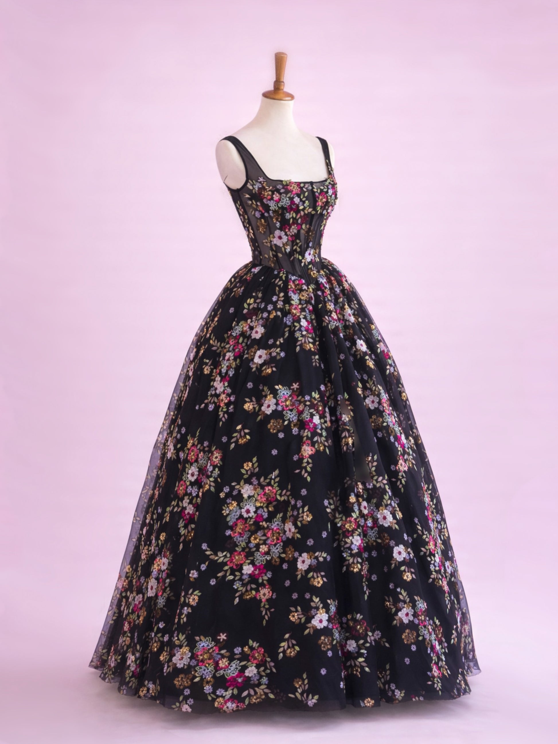 Long evening dress crafted in sequin-embroidered tulle over an illusion tulle and charmeusse base.