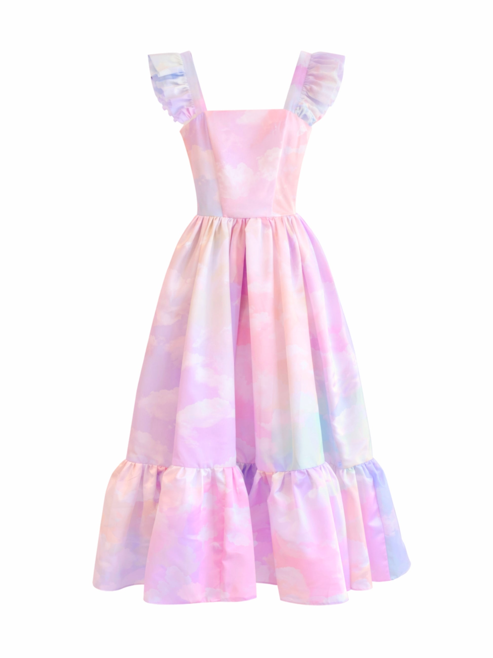 Cotton dress with a cloud print. It features ruffled straps and bows, as well as adjustable ties at the back for a better fit. The skirt includes a ruffle at the hem, functional pockets, and an invisible zipper closure at the back. Approximate length: 85 cm with ruffle. The main photo of the dress is in the "Medio Día" print, which is currently sold out.