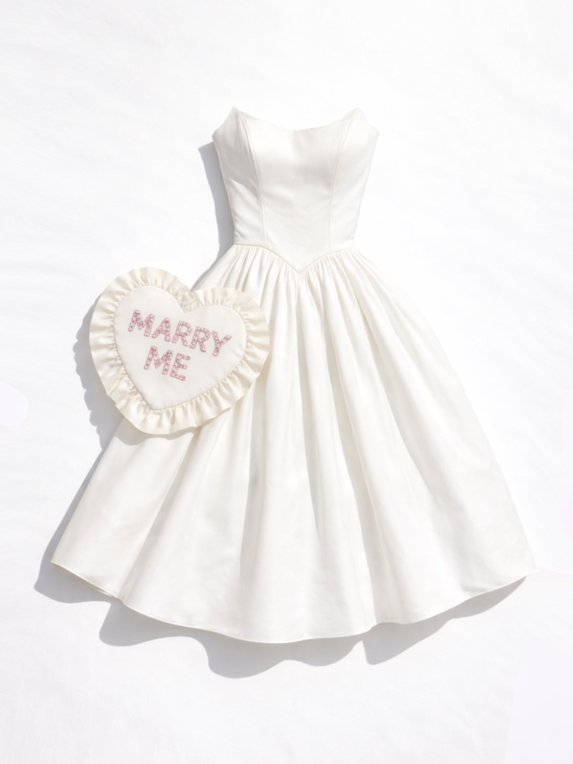 Strapless dress with a corset silhouette, wide skirt, and a heart on the front as the central element of the design.