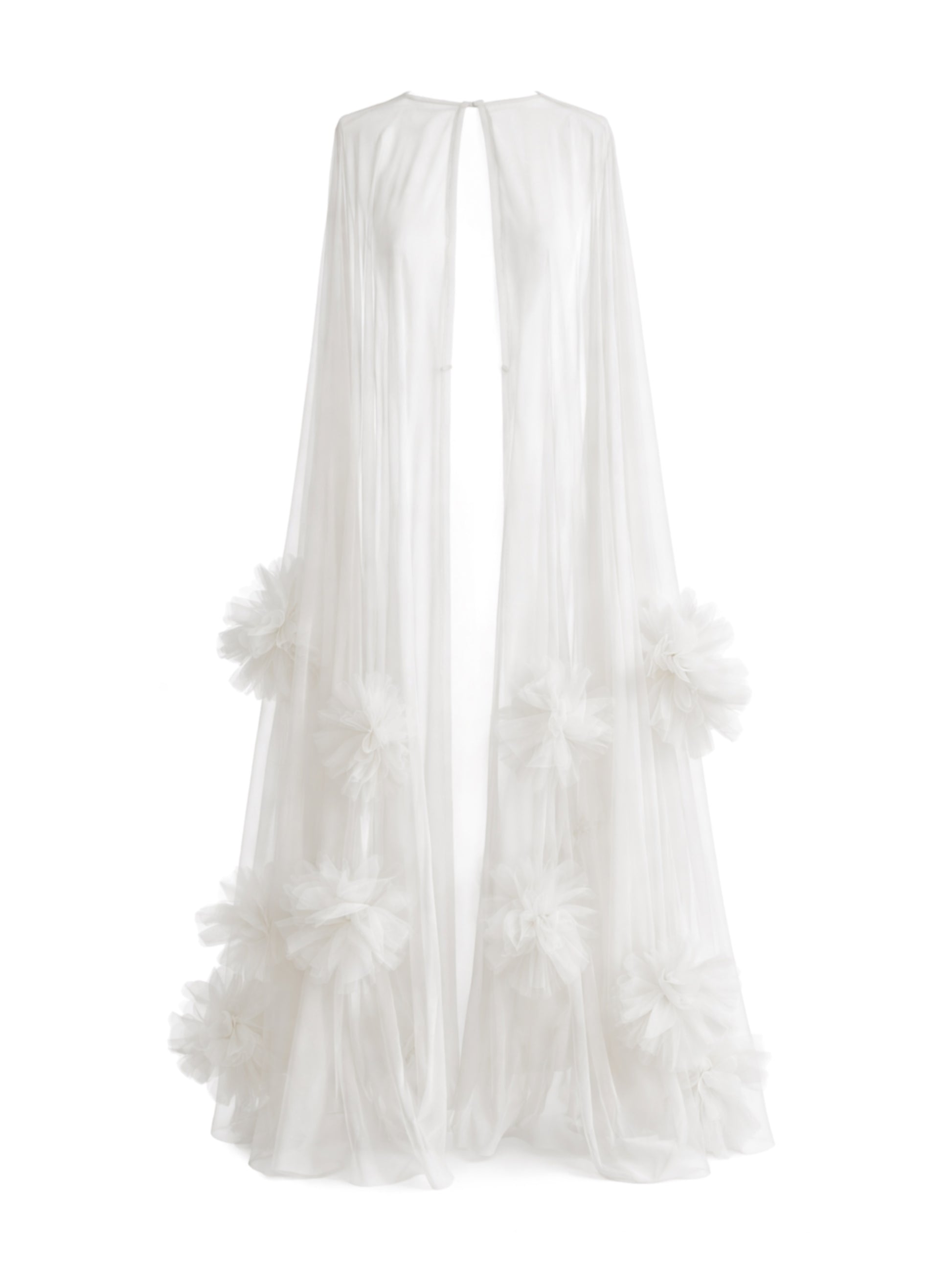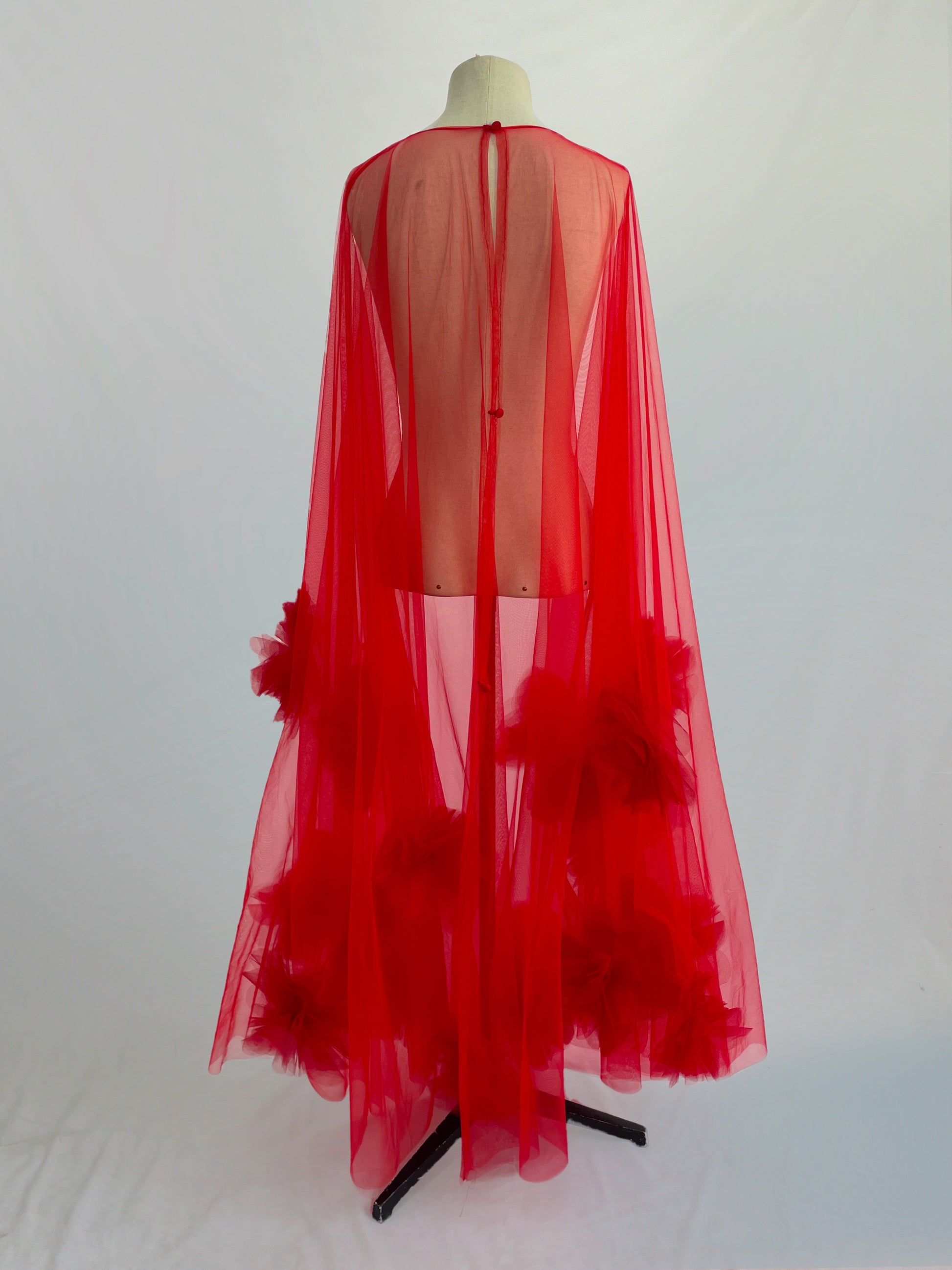 One-size-fits-all cape, approximately 150 cm long, made of tulle with handmade flowers. It can be fully closed at the back with snaps or worn open as an over-cape. It includes openings at the sides for easy access to the hands and can be worn inside out or inside out.