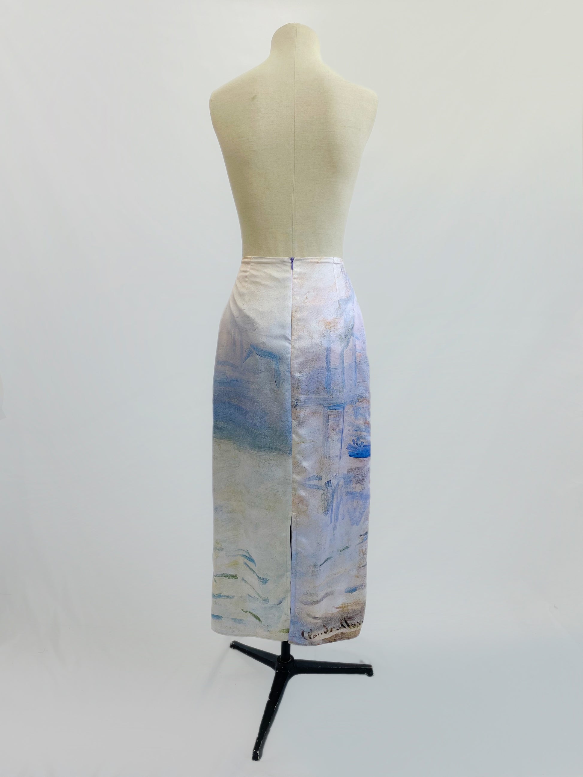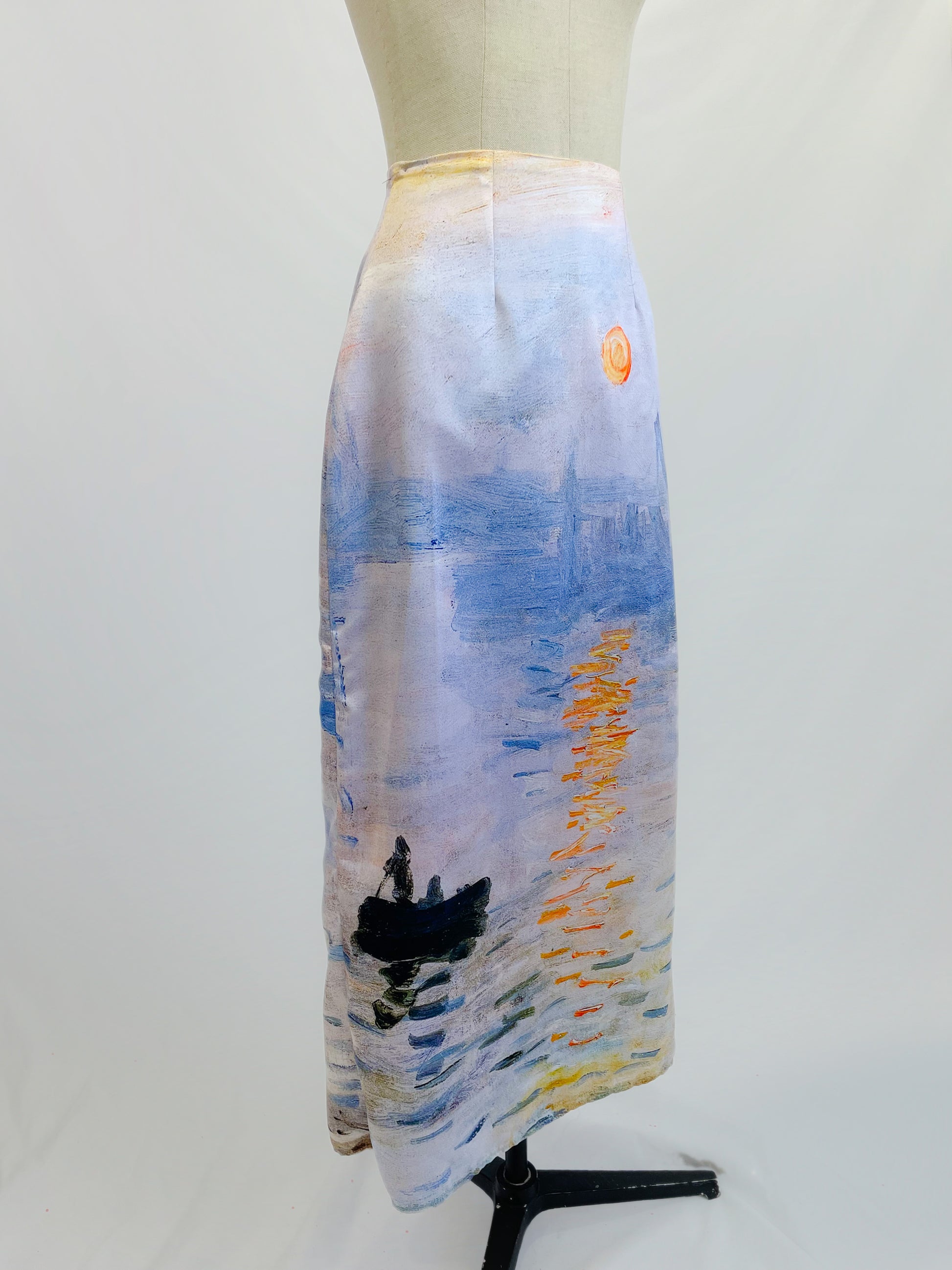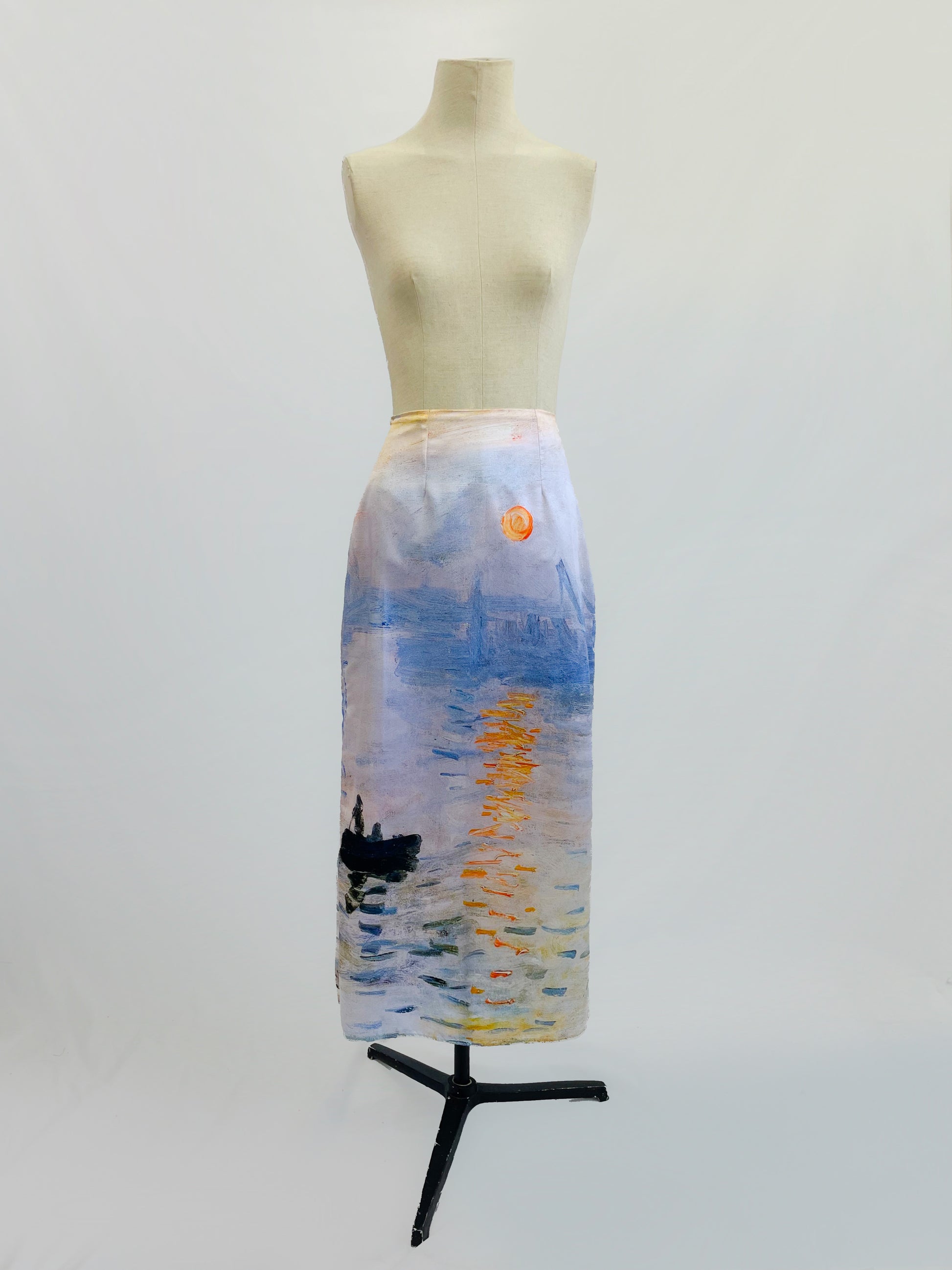 A straight skirt made of satin charmeuse with lining, inspired by Monet's painting Sunrise.