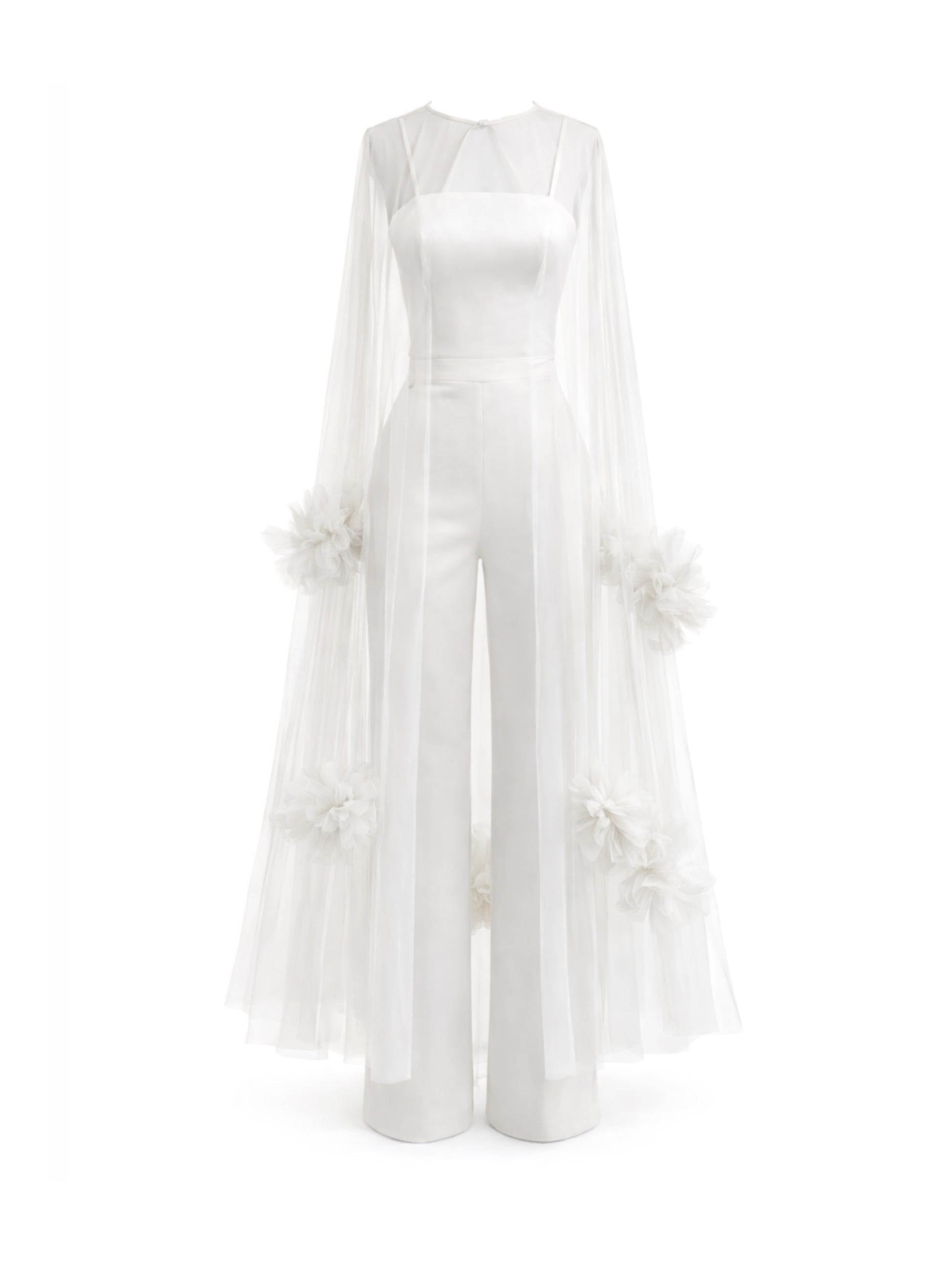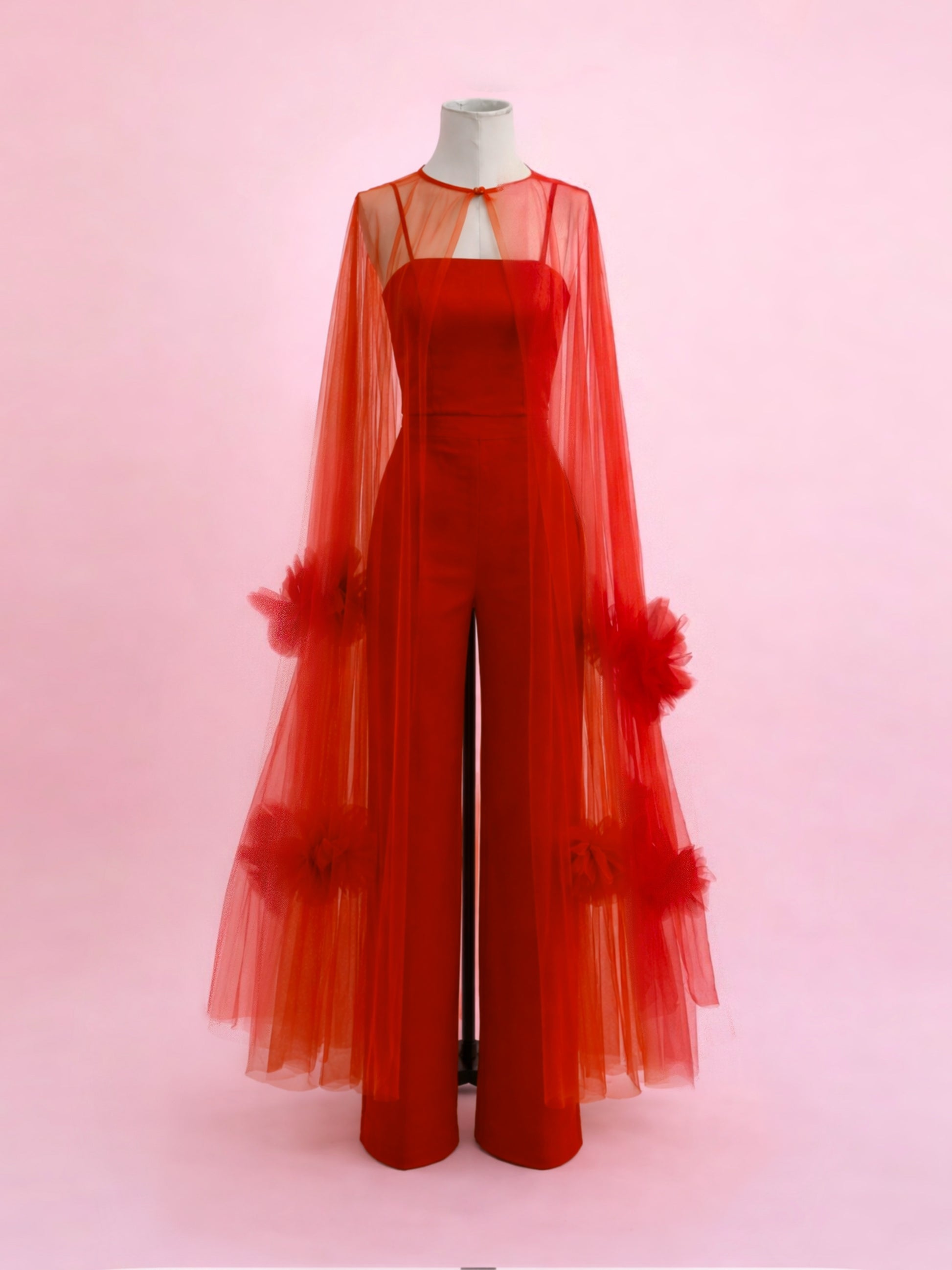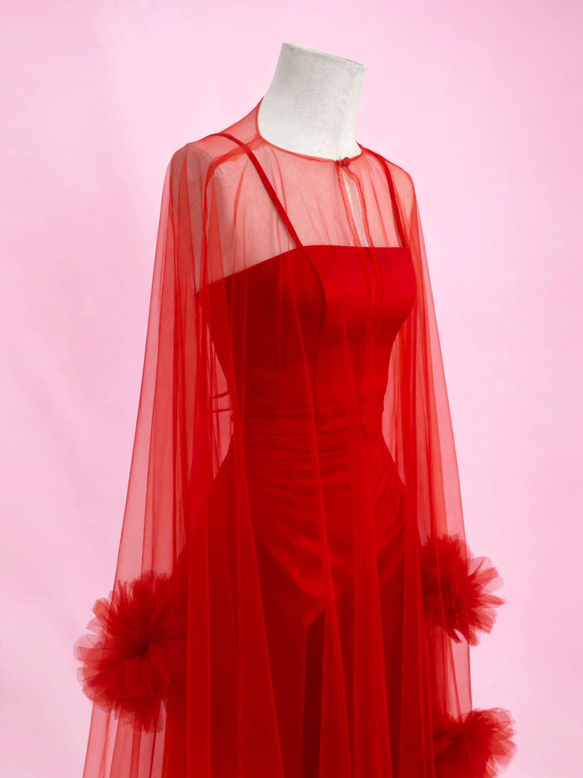 - One-size cape: approximately 150 cm long, with handmade tulle flowers. It can be fully closed at the back with snaps or left open; it has openings at the sides for easy hand access and can be worn right side out or inside out.