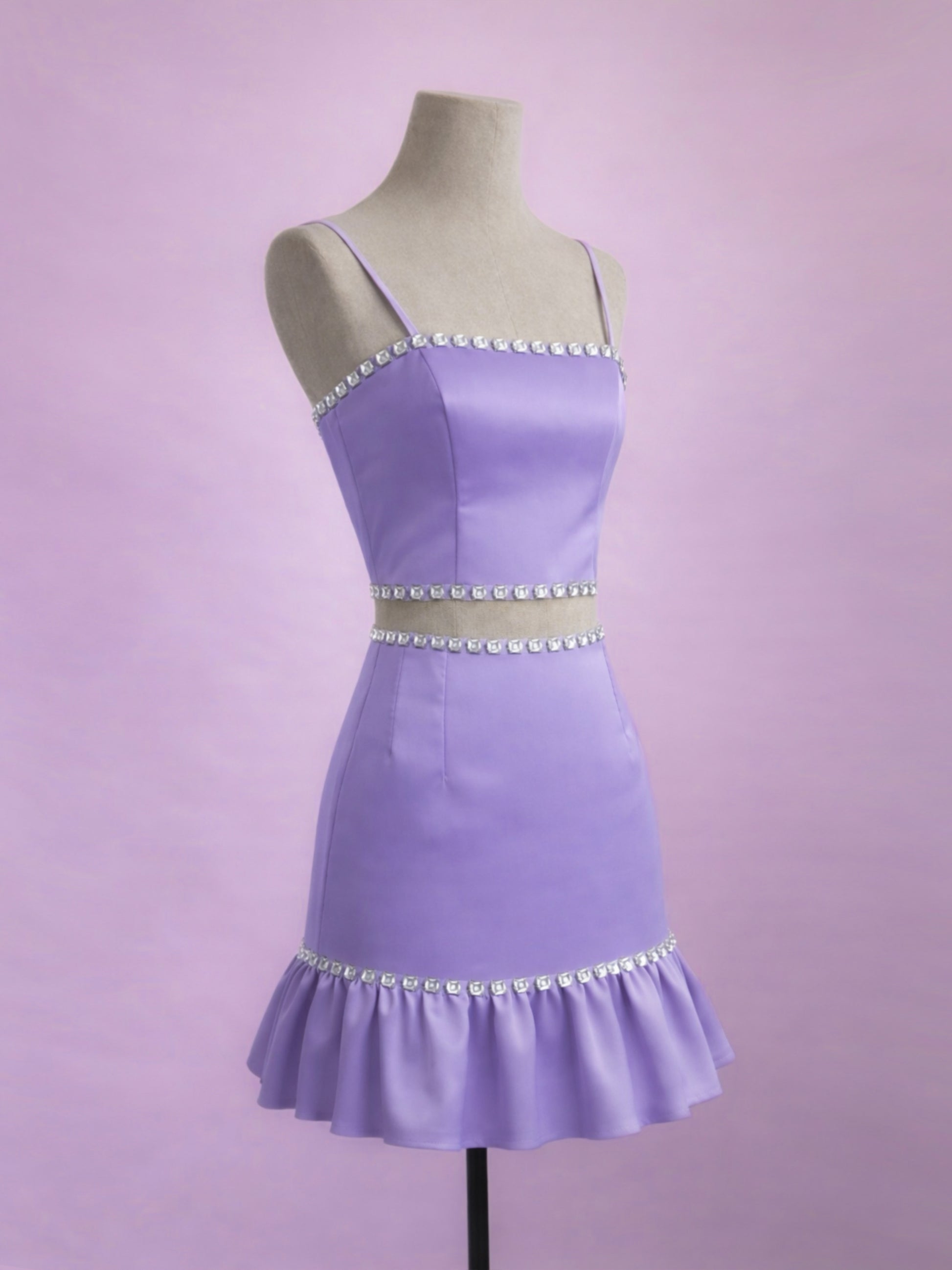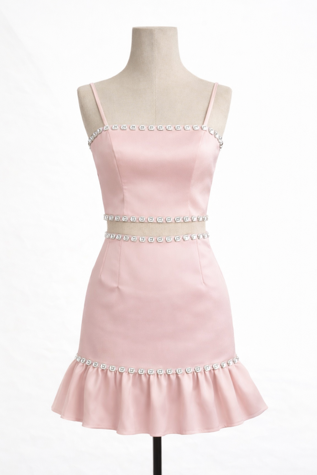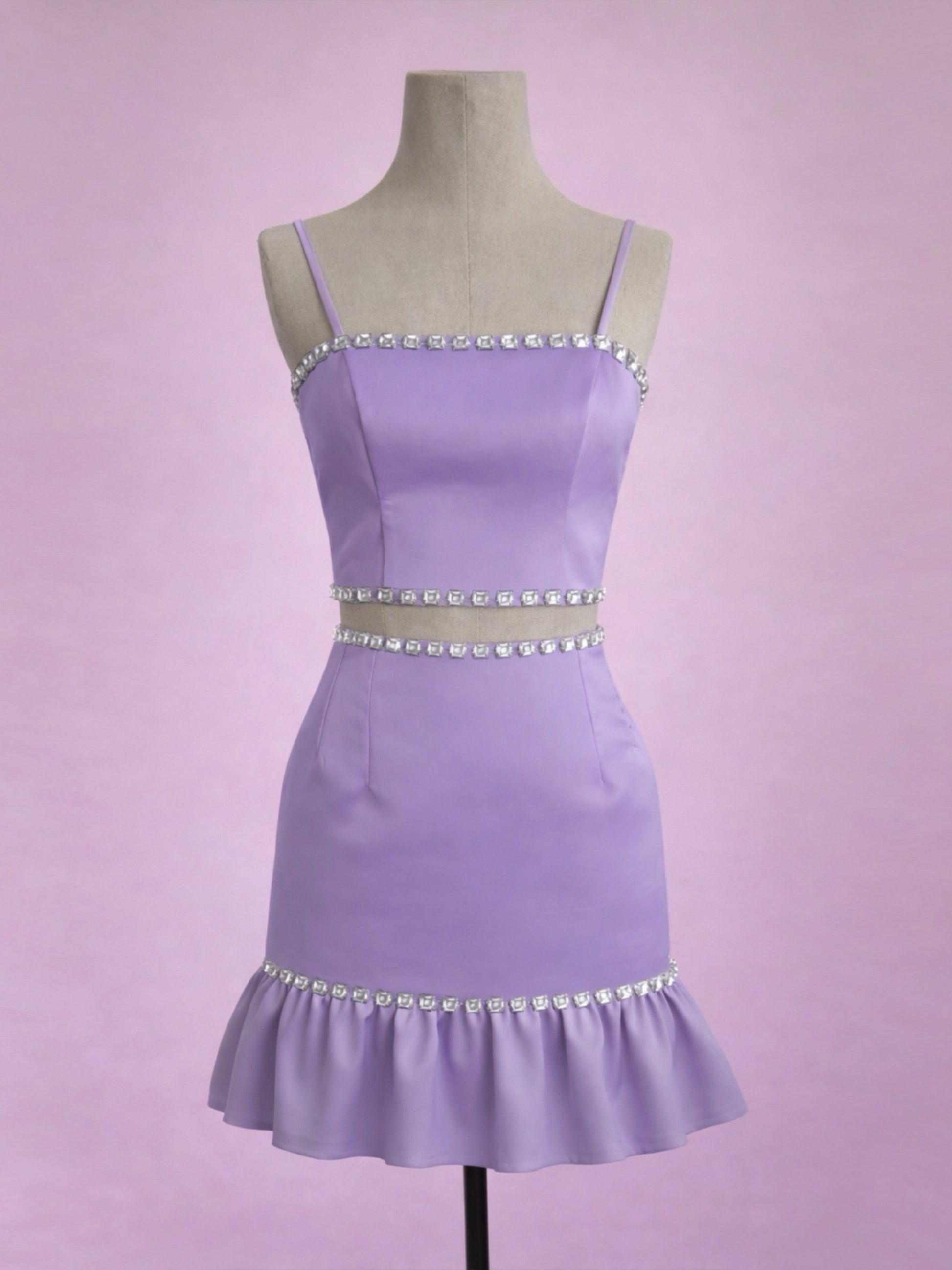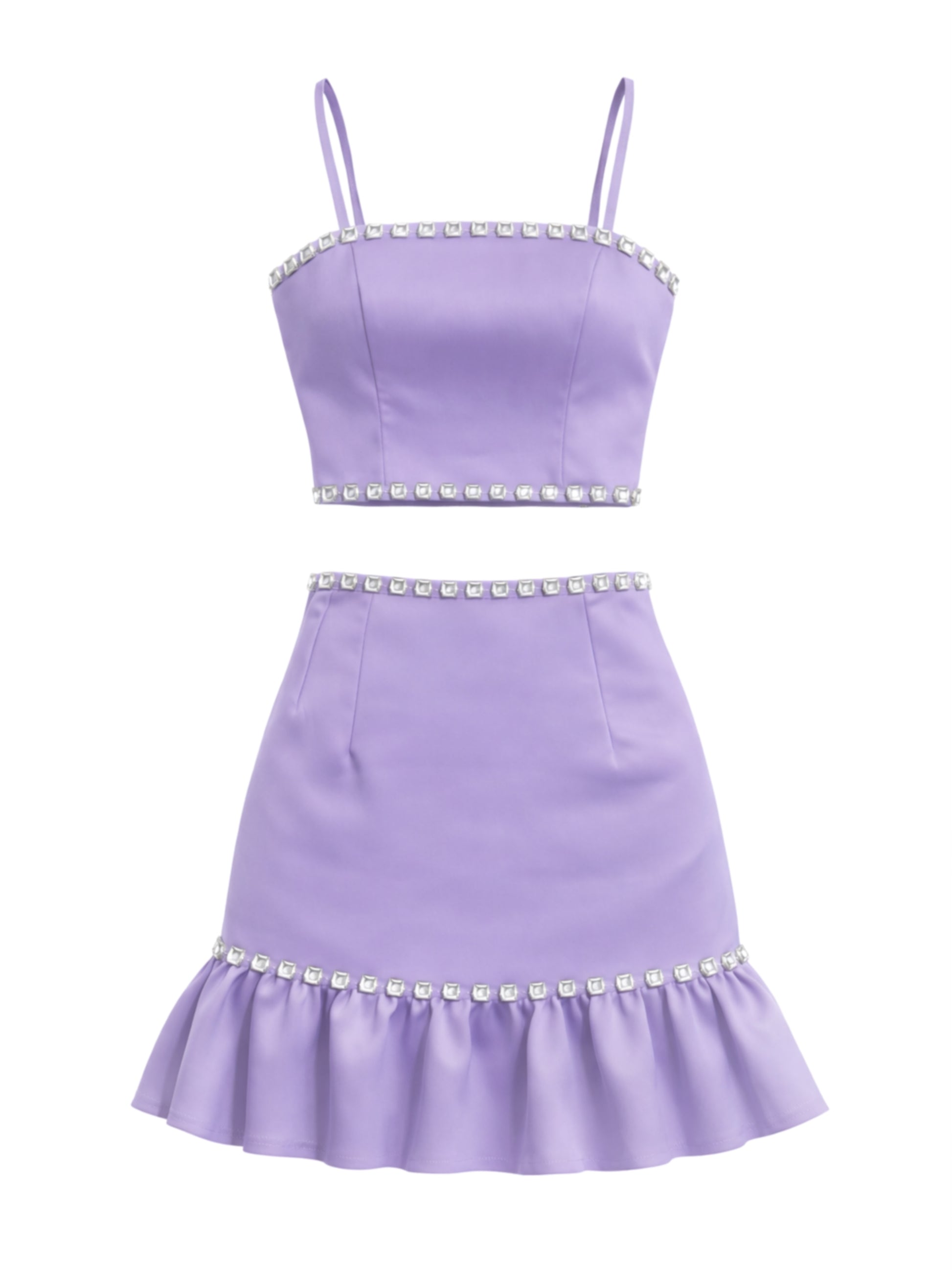 The top features adjustable straps and a clean, structured silhouette, with decorative embellishments at the neckline and hem. The high-waisted skirt has a clean cut and a ruffled hem that adds movement, finished with embellishments at the ruffle's seam. It includes adjustable ties for a better fit.