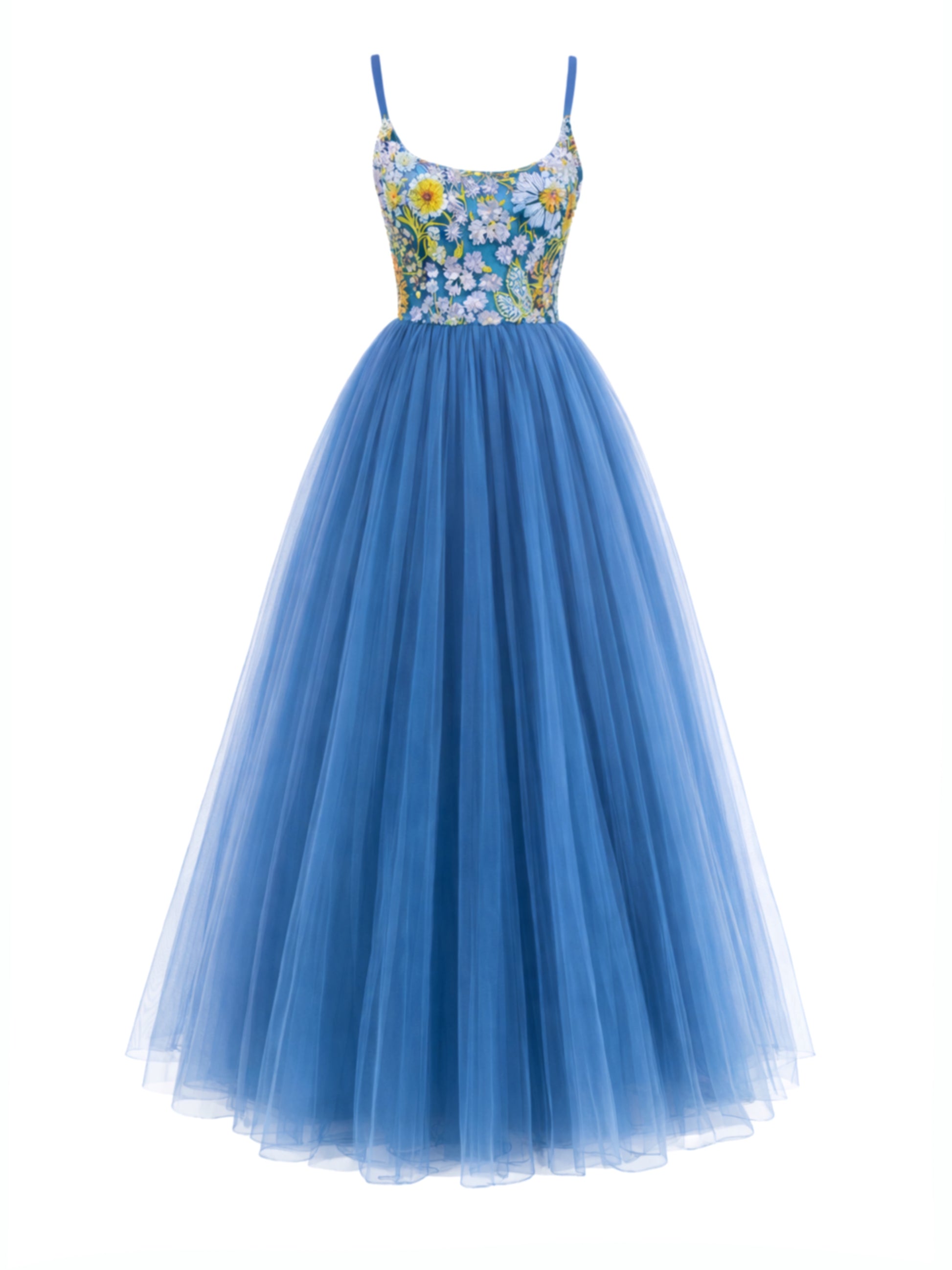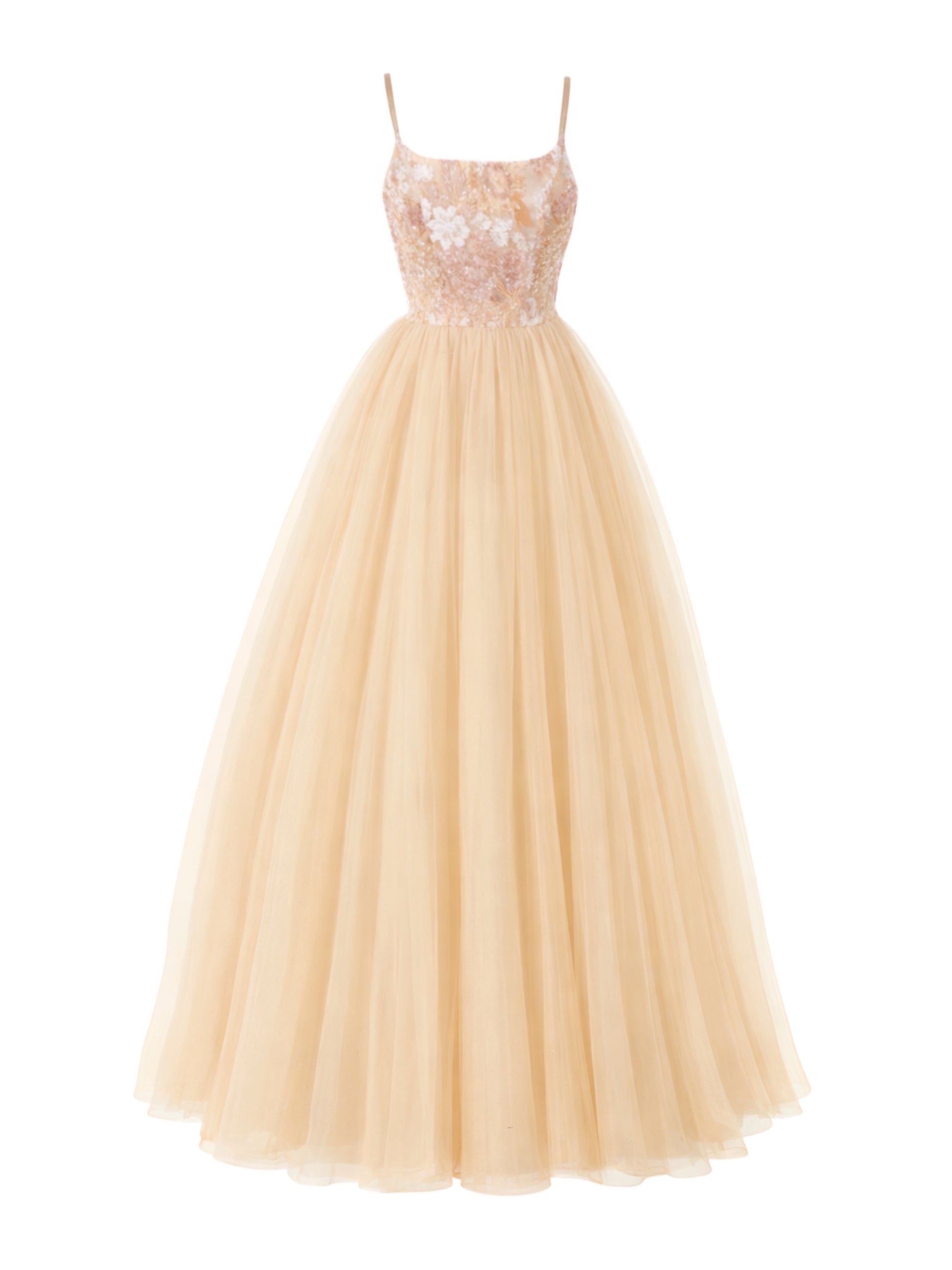 Crisanta is an evening dress whose top is made of tulle embroidered with sequins, with structural rods and integrated nude cups, while the skirt is made of layered plain tulle with a wide drape and light volume.