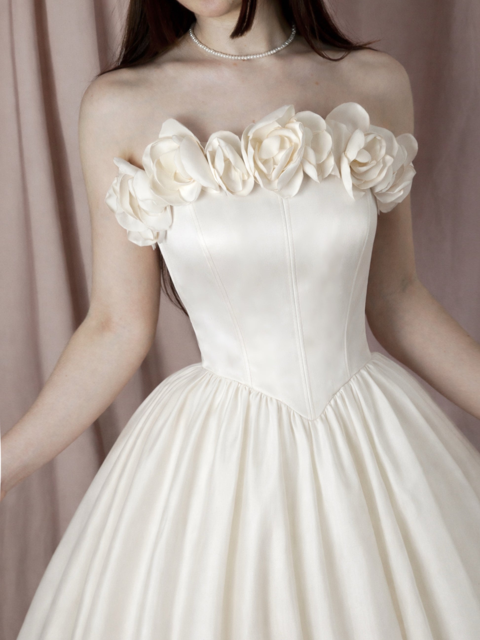 Satin dress with a structured corset-style top and adjustable straps. Crisscrossed ribbons at the back. Handmade flowers at the neckline. Skirt with an invisible zipper, side pockets, built-in crinoline, and an approximate length of 115 cm.