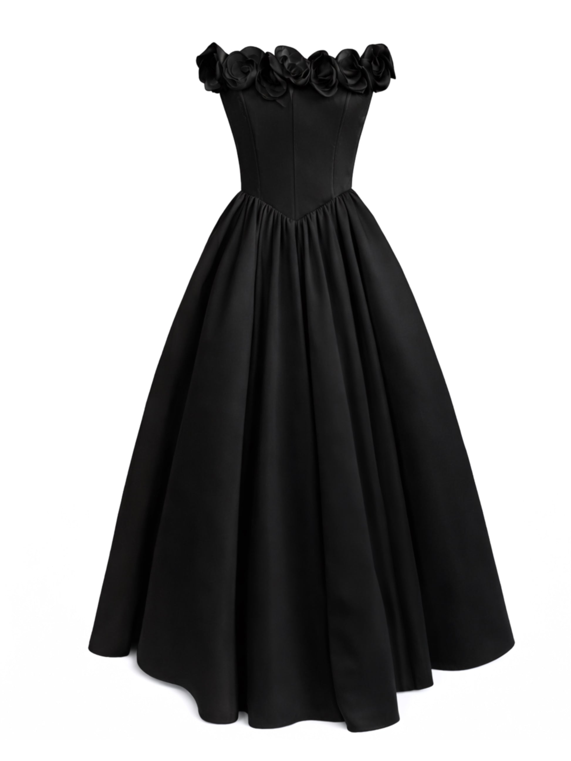 Satin dress with a structured corset-style top and adjustable straps. Crisscrossed ribbons at the back. Handmade flowers at the neckline. Skirt with an invisible zipper, side pockets, built-in crinoline, and an approximate length of 115 cm.