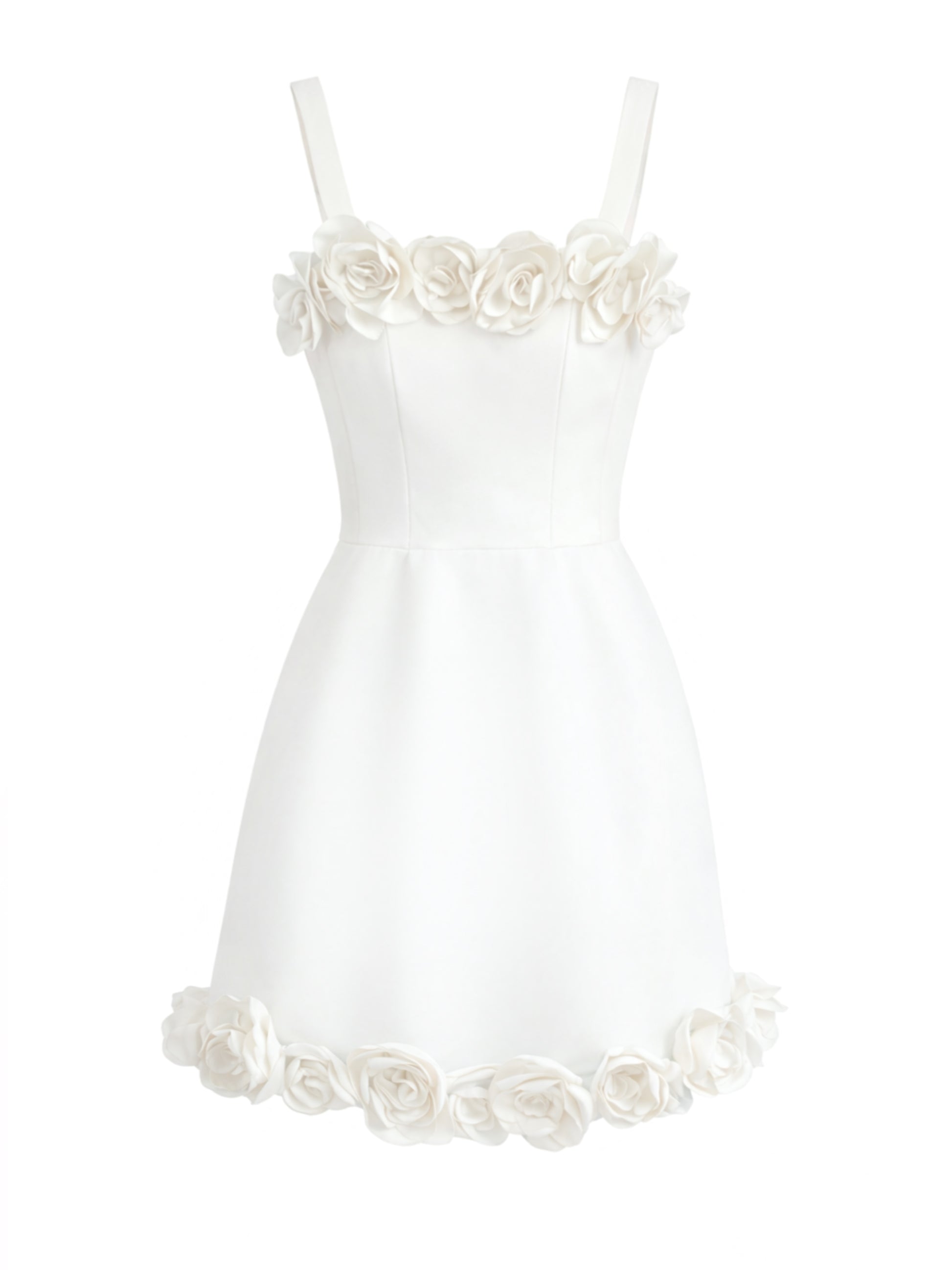 Satin dress with removable and adjustable straps. Crisscrossed back with ribbons. Handmade flowers at the neckline and hem. Skirt with invisible zipper, side pockets, and an approximate length of 45 cm.